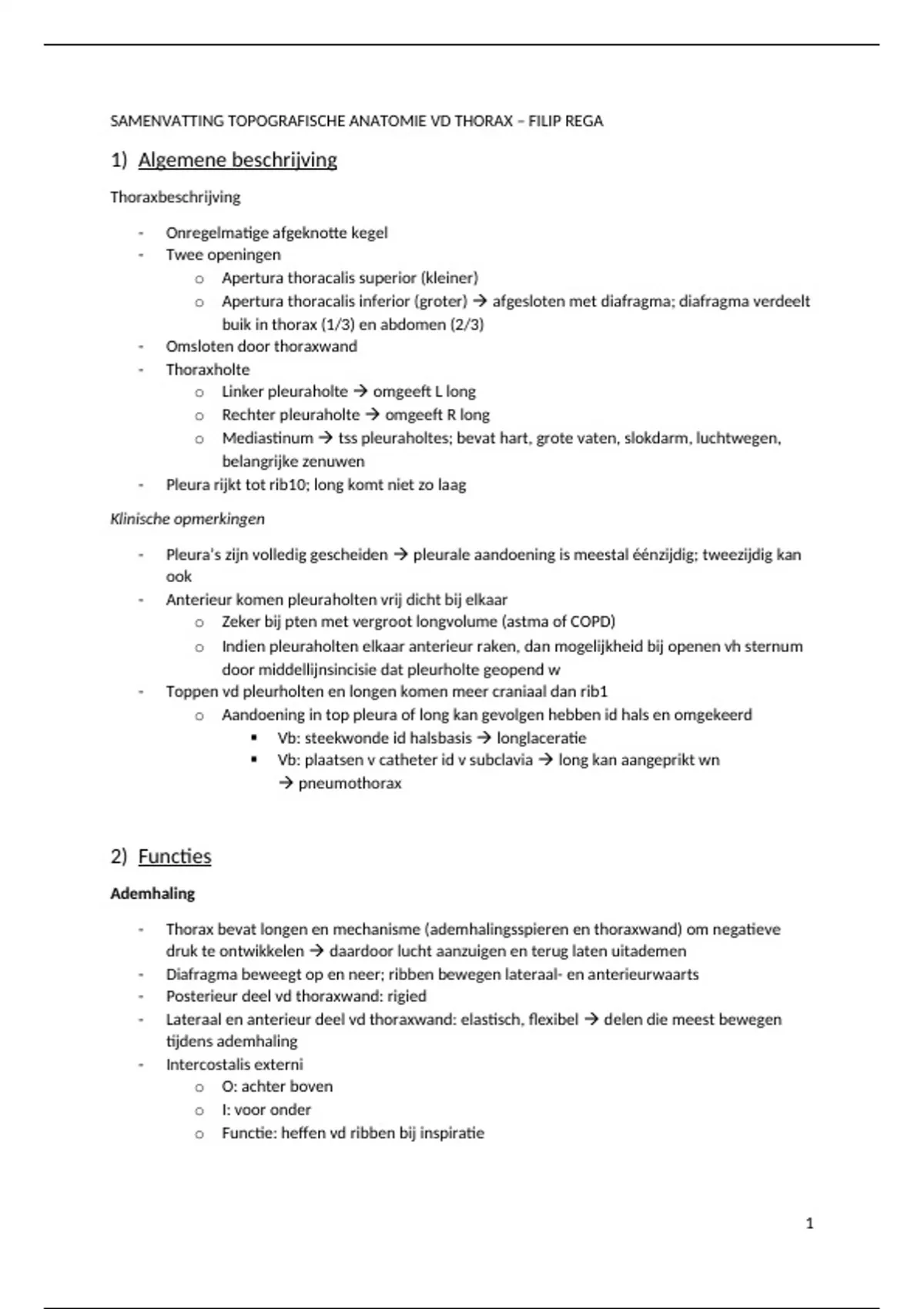 SAMENVATTING TOPOGRAFISCHE ANATOMIE VD THORAX – FILIP REGA