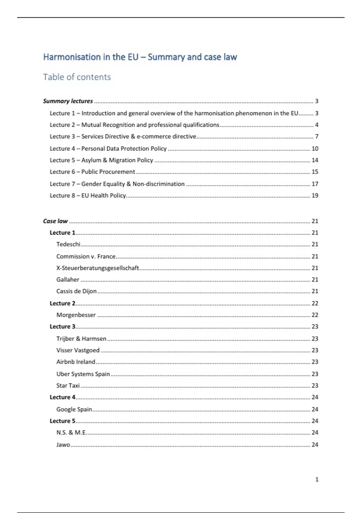 Grade: 8. This document contains a comprehensive summary for the course Harmonisation in the EU. This summary is based on extensive notes from the lectures and reading the prescribed case law. The document includes relevant articles and references to the mandatory case law. The case law is elaborated on at the end of the document, which includes at least the relevant legal rule which follows from the judgement.