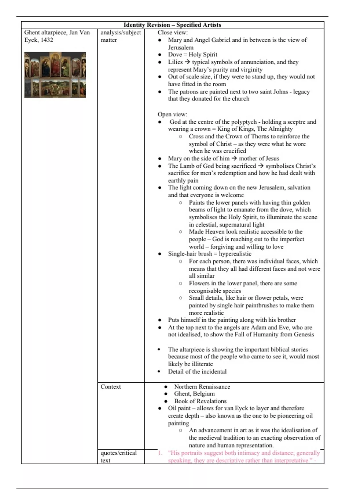 One of the themes in History of Art Paper 1: Identity - notes on each artwork learnt divided into visual analysis, subject matter, context and quotes that could be used to argue for/against - also including possible essay questions that could come up