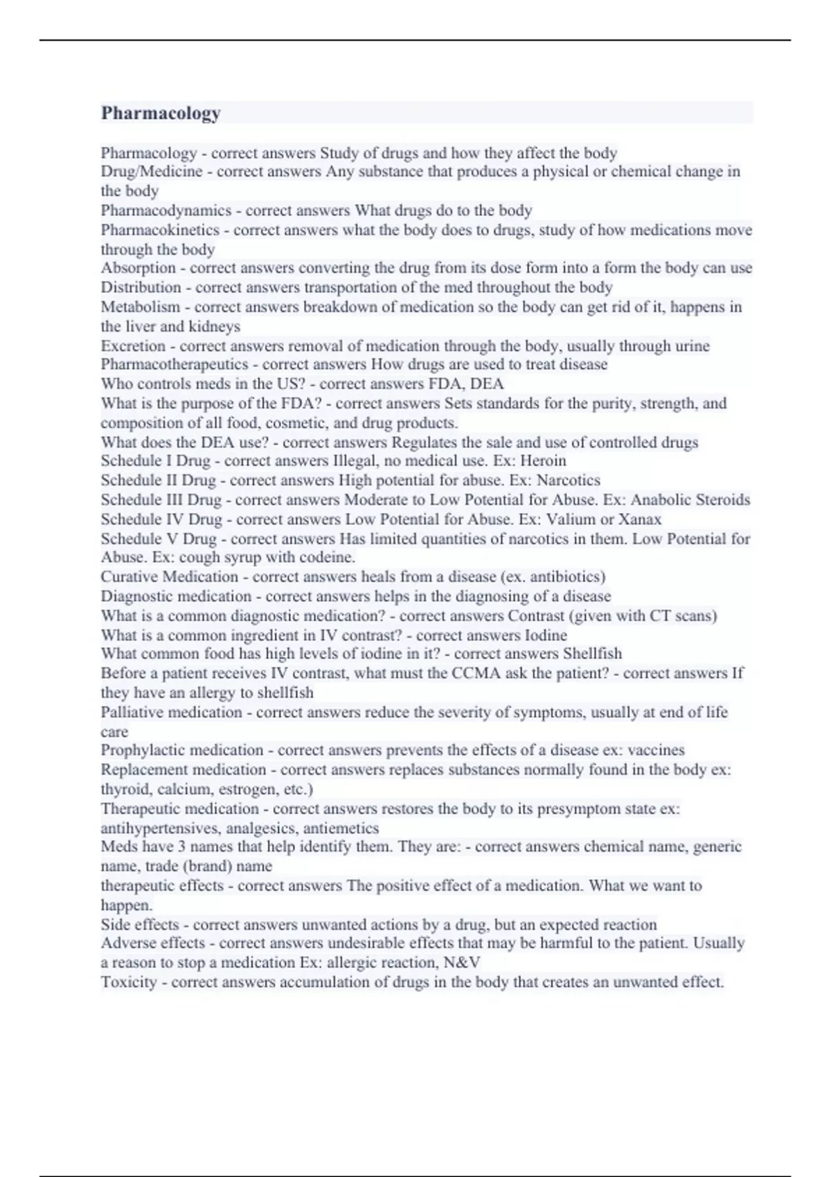 Pharmacology - correct answers Study of drugs and how they affect the body Drug/Medicine - correct answers Any substance that produces a physical or chemical change in the body Pharmacodynamics - correct answers What drugs do to the body Pharmacokinetics - correct answers what the body does to drugs, study of how medications move through the body Absorption - correct answers converting the drug from its dose form into a form the body can use Distribution - correct answers transportation of the med throughout the body Metabolism - correct answers breakdown of medication so the body can get rid of it, happens in the liver and kidneys Excretion - correct answers removal of medication through the body, usually through urine Pharmacotherapeutics - correct answers How drugs are used to treat disease Who controls meds in the US? - correct answers FDA, DEA What is the purpose of the FDA? - correct answers Sets standards for the purity, strength, and composition of all food, cosmetic, and drug products. What does the DEA use? - correct answers Regulates the sale and use of controlled drugs Schedule I Drug - correct answers Illegal, no medical use. Ex: Heroin Schedule II Drug - correct answers High potential for abuse. Ex: Narcotics Schedule III Drug - correct answers Moderate to Low Potential for Abuse. Ex: Anabolic Steroids Schedule IV Drug - correct answers Low Potential for Abuse. Ex: Valium or Xanax Schedule V Drug - correct answers Has limited quantities of narcotics in them. Low Potential for Abuse. Ex: cough syrup with codeine. Curative Medication - correct answers heals from a disease (ex. antibiotics) Diagnostic medication - correct answers helps in the diagnosing of a disease What is a common diagnostic medication? - correct answers Contrast (given with CT scans) What is a common ingredient in IV contrast? - correct answers Iodine What common food has high levels of iodine in it? - correct answers Shellfish Before a patient receives IV contrast, what must the CCMA ask the patient? - correct answers If they have an allergy to shellfish Palliative medication - correct answers reduce the severity of symptoms, usually at end of life care Prophylactic medication - correct answers prevents the effects of a disease ex: vaccines Replacement medication - correct answers replaces substances normally found in the body ex: thyroid, calcium, estrogen, etc.) Therapeutic medication - correct answers restores the body to its presymptom state ex: antihypertensives, analgesics, antiemetics Meds have 3 names that help identify them. They are: - correct answers chemical name, generic name, trade (brand) name therapeutic effects - correct answers The positive effect of a medication. What we want to happen. Side effects - correct answers unwanted actions by a drug, but an expected reaction Adverse effects - correct answers undesirable effects that may be harmful to the patient. Usually a reason to stop a medication Ex: allergic reaction, N&V Toxicity - correct answers accumulation of drugs in the body that creates an unwanted effect.