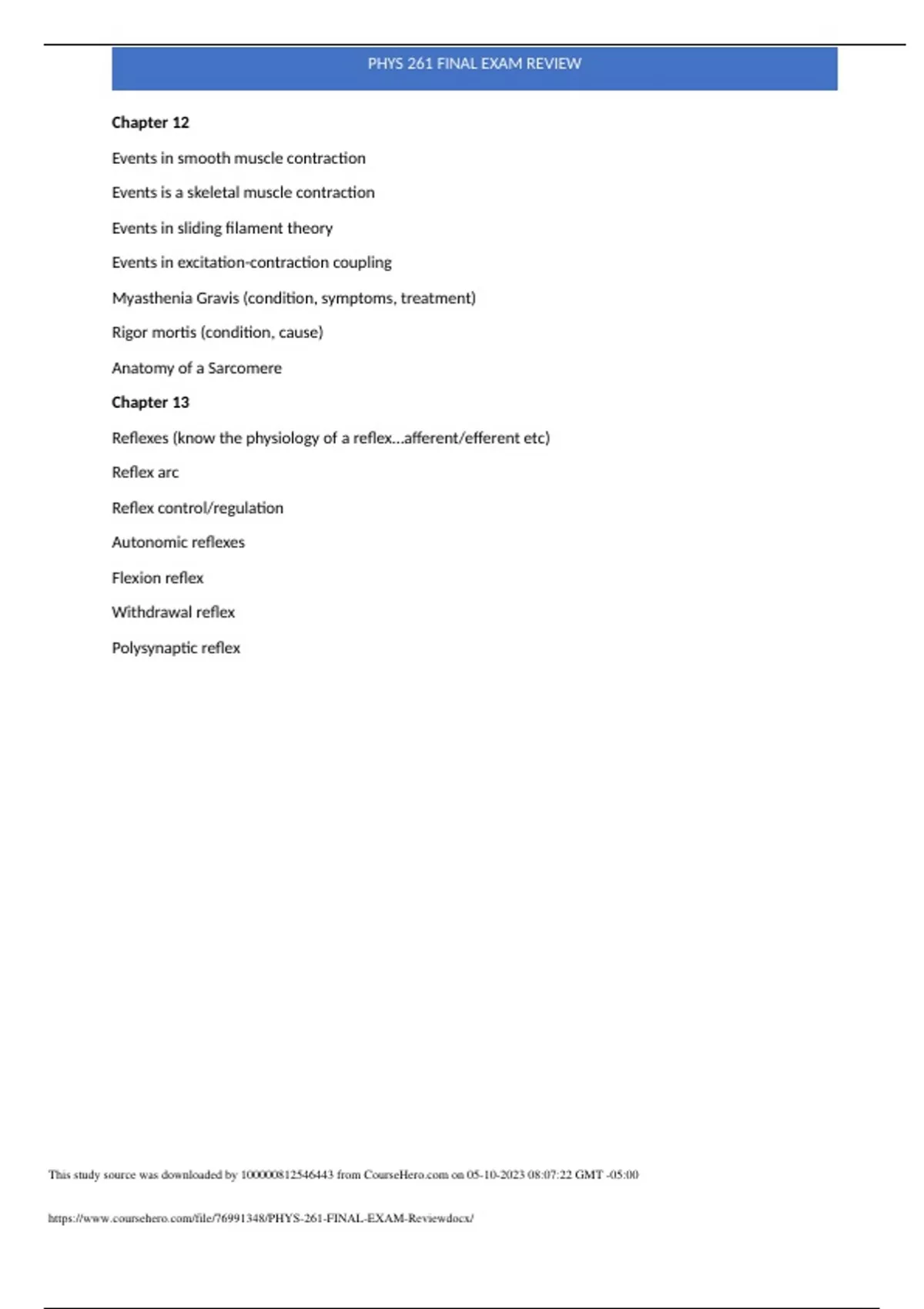 Chapter 12 Events in smooth muscle contraction Events is a skeletal muscle contraction Events in sliding filament theory Events in excitation-contraction coupling Myasthenia Gravis (condition, symptoms, treatment) Rigor mortis (condition, cause) Anatomy of a Sarcomere Chapter 13 Reflexes (know the physiology of a reflex…afferent/efferent etc) Reflex arc Reflex control/regulation Autonomic reflexes Flexion reflex Withdrawal reflex Polysynaptic reflex PHYS 261 FINAL EXAM REVIEW This study source was downloaded by from CourseH on :07:22 GMT -05:00 Chapter 14 Purpose of heart valves Electrical events that take place during a heartbeat (depolarization/repolarization…detailed) SinoAtrial node SA node events in action potential AtrioVentricular node Heart Sounds (Lub Dub- cause) Systole Diastole Frank-Starling law of the heart Stroke Volume End Systolic Volume Details of an ECG (electrocardiogram) Events in Myocardial action potential Chapter 15 Blood pressure interpretation What information does blood pressure provide Cardiac output Organs of the cardiovascular system Mechanoreceptors Baroreceptors Peripheral resistance Echocardiogram Pre-load After-load Atrial systole Ventricular diastol