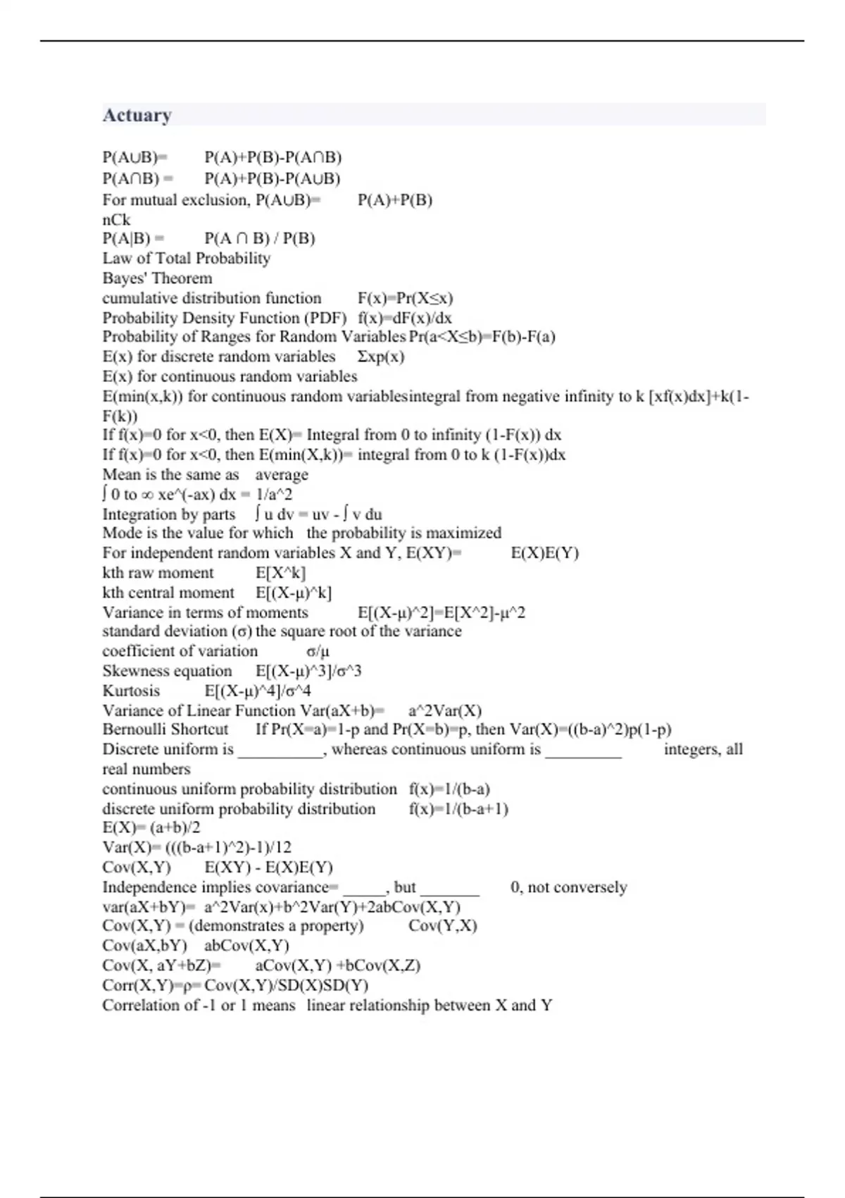 P(A∪B)= P(A)+P(B)-P(A∩B) P(A∩B) = P(A)+P(B)-P(A∪B) For mutual exclusion, P(A∪B)= P(A)+P(B) nCk P(A|B) = P(A ∩ B) / P(B) Law of Total Probability Bayes' Theorem cumulative distribution function F(x)=Pr(X≤x) Probability Density Function (PDF) f(x)=dF(x)/dx Probability of Ranges for Random Variables Pr(aX≤b)=F(b)-F(a) E(x) for discrete random variables Σxp(x) E(x) for continuous random variables E(min(x,k)) for continuous random variables integral from negative infinity to k [xf(x)dx]+k(1-F(k)) If f(x)=0 for x0, then E(X)= Integral from 0 to infinity (1-F(x)) dx If f(x)=0 for x0, then E(min(X,k))= integral from 0 to k (1-F(x))dx Mean is the same as average ∫ 0 to ∞ xe^(-ax) dx = 1/a^2 Integration by parts ∫ u dv = uv - ∫ v du Mode is the value for which the probability is maximized For independent random variables X and Y, E(XY)= E(X)E(Y) kth raw moment E[X^k] kth central moment E[(X-μ)^k] Variance in terms of moments E[(X-μ)^2]=E[X^2]-μ^2 standard deviation (σ) the square root of the variance coefficient of variation σ/μ Skewness equation E[(X-μ)^3]/σ^3 Kurtosis E[(X-μ)^4]/σ^4 Variance of Linear Function Var(aX+b)= a^2Var(X) Bernoulli Shortcut If Pr(X=a)=1-p and Pr(X=b)=p, then Var(X)=((b-a)^2)p(1-p) Discrete uniform is __________, whereas continuous uniform is _________ integers, all real numbers continuous uniform probability distribution f(x)=1/(b-a) discrete uniform probability distribution f(x)=1/(b-a+1) E(X)= (a+b)/2 Var(X)= (((b-a+1)^2)-1)/12 Cov(X,Y) E(XY) - E(X)E(Y) Independence implies covariance= _____, but _______ 0, not conversely var(aX+bY)= a^2Var(x)+b^2Var(Y)+2abCov(X,Y) Cov(X,Y) = (demonstrates a property) Cov(Y,X) Cov(aX,bY) abCov(X,Y) Cov(X, aY+bZ)= aCov(X,Y) +bCov(X,Z) Corr(X,Y)=ρ= Cov(X,Y)/SD(X)SD(Y) Correlation of -1 or 1 means linear relationship between X and Y
