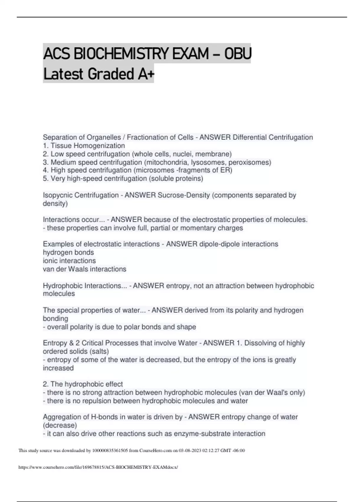 This study source was downloaded by from CourseH on :12:27 GMT -06:00 ACS BIOCHEMISTRY EXAM – OBU Latest Graded A+ Separation of Organelles / Fractionation of Cells - ANSWER Differential Centrifugation 1. Tissue Homogenization 2. Low speed centrifugation (whole cells, nuclei, membrane) 3. Medium speed centrifugation (mitochondria, lysosomes, peroxisomes) 4. High speed centrifugation (microsomes -fragments of ER) 5. Very high-speed centrifugation (soluble proteins) Isopycnic Centrifugation - ANSWER Sucrose-Density (components separated by density) Interactions occur... - ANSWER because of the electrostatic properties of molecules. - these properties can involve full, partial or momentary charges Examples of electrostatic interactions - ANSWER dipole-dipole interactions hydrogen bonds ionic interactions van der Waals interactions Hydrophobic Interactions... - ANSWER entropy, not an attraction between hydrophobic molecules The special properties of water... - ANSWER derived from its polarity and hydrogen bonding - overall polarity is due to polar bonds and shape Entropy & 2 Critical Processes that involve Water - ANSWER 1. Dissolving of highly ordered solids (salts) - entropy of some of the water is decreased, but the entropy of the ions is greatly increased 2. The hydrophobic effect - there is no strong attraction between hydrophobic molecules (van der Waal's only) - there is no repulsion between hydrophobic molecules and water Aggregation of H-bonds in water is driven by - ANSWER entropy change of water (decrease) - it can also drive other reactions such as enzyme-substrate interaction This study source was downloaded by from CourseH on :12:27 GMT -06:00 Ion Product Constant - ANSWER [H+][OH-] = Keq [HOH] = 1.0 x 10^-14 This study source was downloaded by from CourseH on :12:27 GMT -06:00 Equilibrium Constant - ANSWER Keq = [H+][OH-]/[HOH] 2 Applications of pH - ANSWER 1. Controlling pH with buffers 2. How pH (protonation) affects weak interactions of molecules (charge and ability to form H-bonds) pKa = - ANSWER -log Ka pKa definition - ANSWER pH at which half of the acid is ionized. titration curves reveal the pKa of weak acids - is a measure of affinity for protons a high pKa constitutes... - ANSWER it takes a high pH (lots of OH-) to remove the H+ from the acid - the acid has a high affinity for H+ - if the pKa is high, it has a HIGH affinity (want) to grab onto H+, because of the large amount of OHSignificance of Buffering - ANSWER 1. Homeostasis 2. This phenomenon is very important for biochemical activity - many reactions depend on the state of protonation of particular functional groups A buffer is made... - ANSWER from a weak acid and its conjugate base Henderson-Hasselbalch Equation - ANSWER pH = pKa + log ([A-]/[HA]) (unprotonated over protonated) Decent Buffering occurs... - ANSWER within around 1 pH unit of pKa (ration of A/HA is between 1/10 or 10/1 Buffering of Blood - ANSWER blood is primarily buffered by the bicarbonate system (CO2/HCO3-) but also by phosphoric acid system (H2PO4-/H3PO4) The hydration of CO2 (middle equilibrium) is greatly enhanced by the enzyme... - ANSWER carbonic anhydrase Carbonic anhydrase - ANSWER raises H+ conc in RBC's, therefore affecting the ionization of hemoglobin side chains which affects O2 binding and release How will breathing rate affect the CO2/HCO3- equilibrium? - ANSWER excessive breathing creates a low level of CO2 in the blood - if CO2 levels increase, the brain tells the lungs to increase rate and depth of breathing to bring the levels down This study source was downloaded by from CourseH on :12:27 GMT -06:00 Shallow or slow breathing... - ANSWER will eventually cause elevated blood CO2 levels, equilibrium to shift to the right, the H3O+ conc. increases and pH drops Inside cells buffering is achieved by... - ANSWER phosphate ions and amino acid side chains on proteins Non-polar, aliphatic R groups - ANSWER glycine, alanine, proline, valine, leucine, isoleucine, methionine Aromatic R groups - ANSWER phenylalanine, tryptophan, tyrosine Polar, uncharged R groups - ANSWER serine, threonine, cysteine, asparagine, glutamine Negatively charged R groups - ANSWER aspartate, glutamate Positively charged R groups - ANSWER lysine, arginine, histidine PI (isoelectric point) - ANSWER the pH value at which the molecule carries no electrical charge. Which atoms around the peptide bond are coplanar? - ANSWER O C-C-N-C H Column Chromatography - ANSWER Amino Acids and proteins can be separated based on their interactions with a stationary phase packed into a column 1. Don't stick > they come off with the effluent 2. Stick to the column or interact with the matrix > their flow is slowed. Derivative and HPLC chromatography - ANSWER Mass Spec - ANSWER Size Exclusion (Gel filtration chromatography) - ANSWER - protein mixture is added to column containing cross-linked polymer - protein molecules separate by size; larger molecules pass more freely appearing in the earlier fractions Affinity chromatography - ANSWER -solution of ligand is added to column - protein mixture is added to column containing a polymer-bound ligand specific for protein of interest -unwanted proteins are washed through the column - protein of interest is eluted by ligand solution Electrophoresis - ANSWER - cross linked polymers act as molecular sieves This study source was downloaded by from CourseH on :12:27 GMT -06:00 (A. polyacrylamide B. agarose) - an electric field moves the proteins thru the matrix migration is determined by charge, and size and shape of the molecule 3 Types of Electrophoresis - ANSWER 1. Native electrophoresis 2. SDS electrophoresis (sodium-dodecyl sulfate) 3. Isoelectric focusing 2-D gels - ANSWER 2-dimensional electrophoresis combines isoelectric focusing and SDS gel Isoelectric focusing - ANSWER - establish a pH gradient using an electric field and electrolytes in a gel tube or plastic strip - apply protein sample to Gel > proteins migrate through the pH gr
