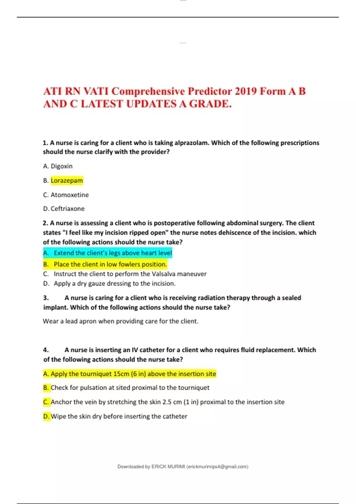 ATI RN VATI Comprehensive Predictor 2019 Form A B AN C FORM A 1. A nurse is caring for a client who is taking alprazolam. Which of the following prescriptions should the nurse clarify with the provider? A. Digoxin B. Lorazepam C. Atomoxetine D. Ceftriaxone 2. A nurse is assessing a client who is postoperative following abdominal surgery. The client states