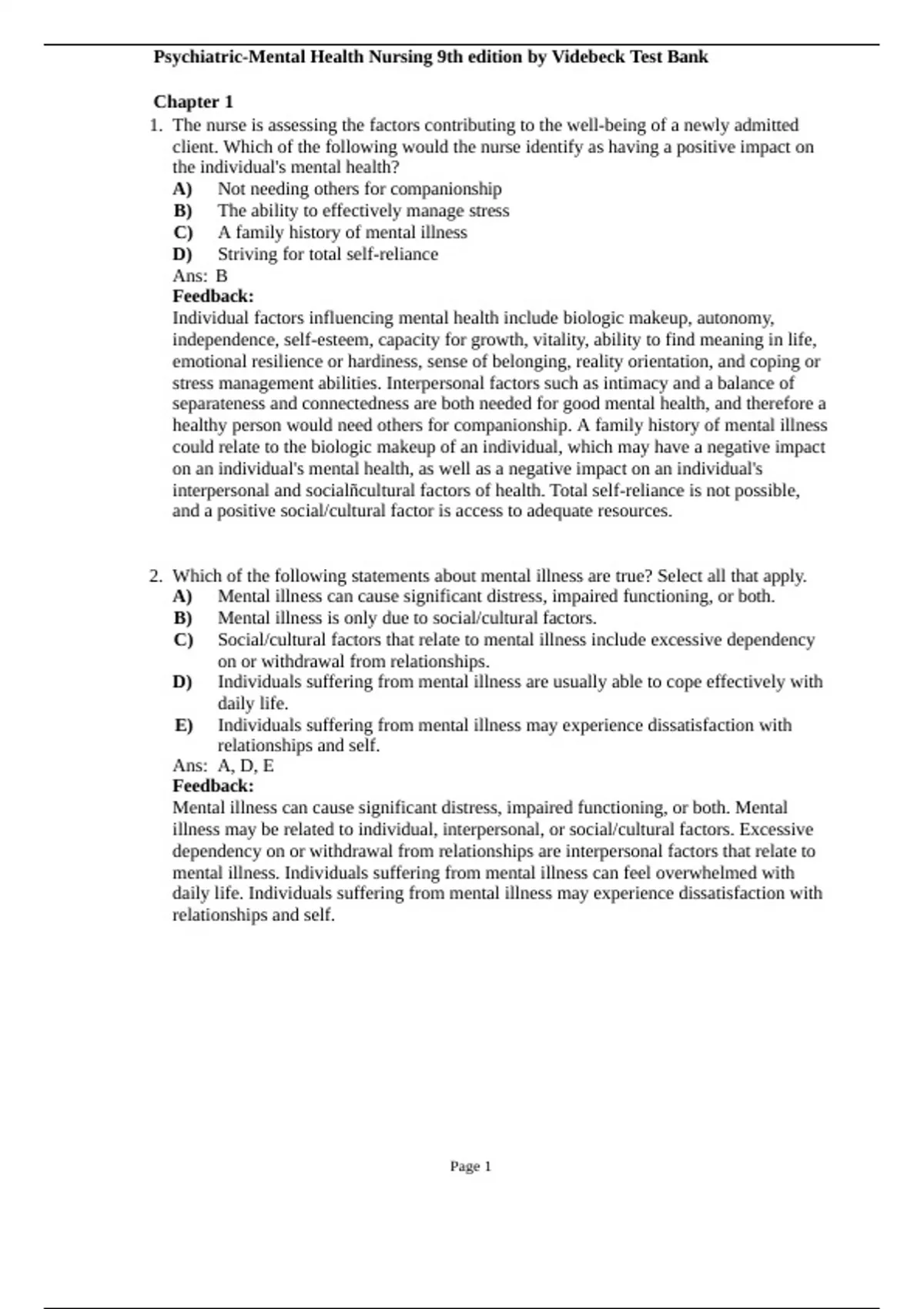 Psychiatric-Mental Health Nursing 9th edition by Videbeck Test Bank