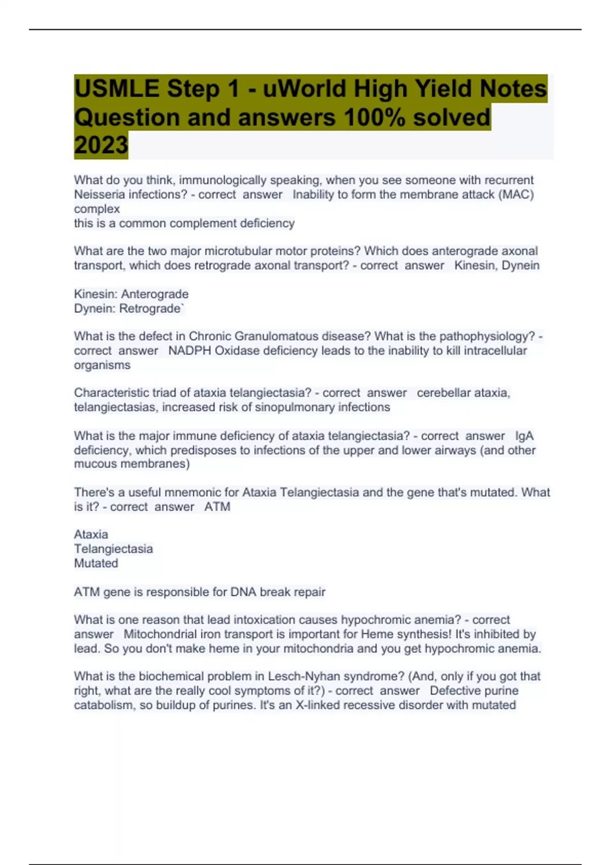 USMLE Step 1 - uWorld High Yield Notes Question and answers 100% solved 2023What do you think, immunologically speaking, when you see someone with recurrent Neisseria infections? Inability to form the membrane attack (MAC) complex this is a common complement deficiency What are the two major microtubular motor proteins? Which does anterograde axonal transport, which does retrograde axonal transport? Kinesin, Dynein Kinesin: Anterograde Dynein: Retrograde` What is the defect in Chronic Granulomatous disease? What is the pathophysiology? NADPH Oxidase deficiency leads to the inability to kill intracellular organisms Characteristic triad of ataxia telangiectasia? cerebellar ataxia, telangiectasias, increased risk of sinopulmonary infections What is the major immune deficiency of ataxia telangiectasia? IgA deficiency, which predisposes to infections of the upper and lower airways (and other mucous membranes) There's a useful mnemonic for Ataxia Telangiectasia and the gene that's mutated. What is it? ATM Ataxia Telangiectasia Mutated ATM gene is responsible for DNA break repair What is one reason that lead intoxication causes hypochromic anemia? Mitochondrial iron transport is important for Heme synthesis! It's inhibited by lead. So you don't make heme in your mitochondria and you get hypochromic anemia. What is the biochemical problem in Lesch-Nyhan syndrome? (And, only if you got that right, what are the really cool symptoms of it?) Defective purine catabolism, so buildup of purines. It's an X-linked recessive disorder with mutated HGPRT gene (hypoxanthine-guanine phosphoribosyltransferase, if you want to impress people). Now, if you got HGPRT and purine catabolism right, you can say: self-mutilating behavior on top of mental retardation, choreoathetoid (think Chorea) movements and spasticity. What is the defect in Niemann-Pick disease? What causes that? What is the common macular finding? Sphingolipid degradation is defective Caused by an autosomal recessive defect in sphingomyelinase Cherry Spot on the macula? Niemann Pick's or Tay Sach's. If a baby gets exposed to an unclean knife (...) and subsequently develops rigid paralysis, what is the diagnosis, where do we think this might happen, and how do we prevent it? Neonatal Tetanus Developing Countries Maternal immunization with tetanus toxoid is the best way to prevent it an adeuately immunized mom will transfer IgG's across the placenta to the neonate Which microtubule associated protein aids in anterograde transport of intracellular vesicles and organelles? Which end of the microtubule do they go towards? Kinesin. Towards the (+) rapidly growing