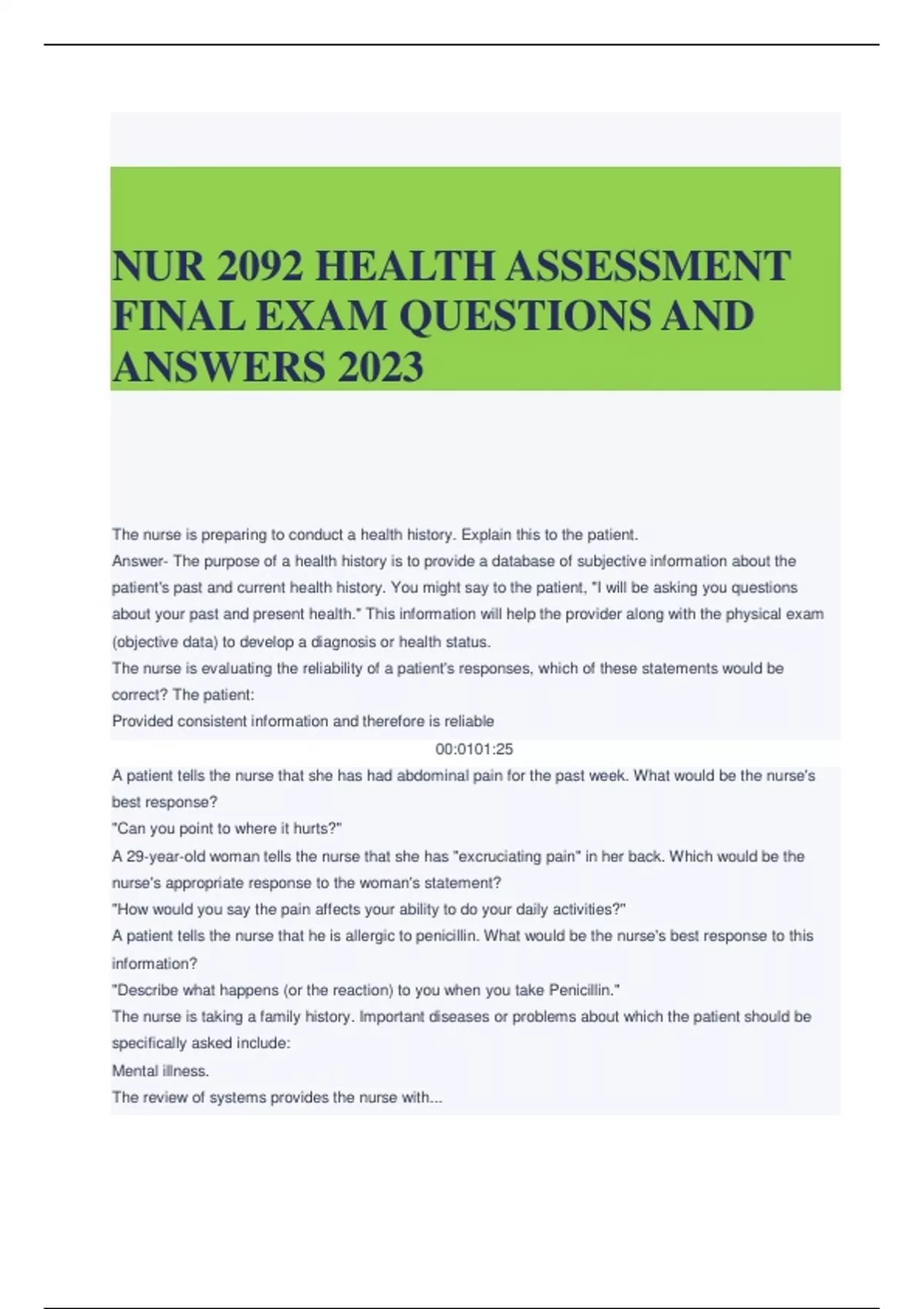 NUR 2092 HEALTH ASSESSMENT FINAL EXAM QUESTIONS AND ANSWERS 2023