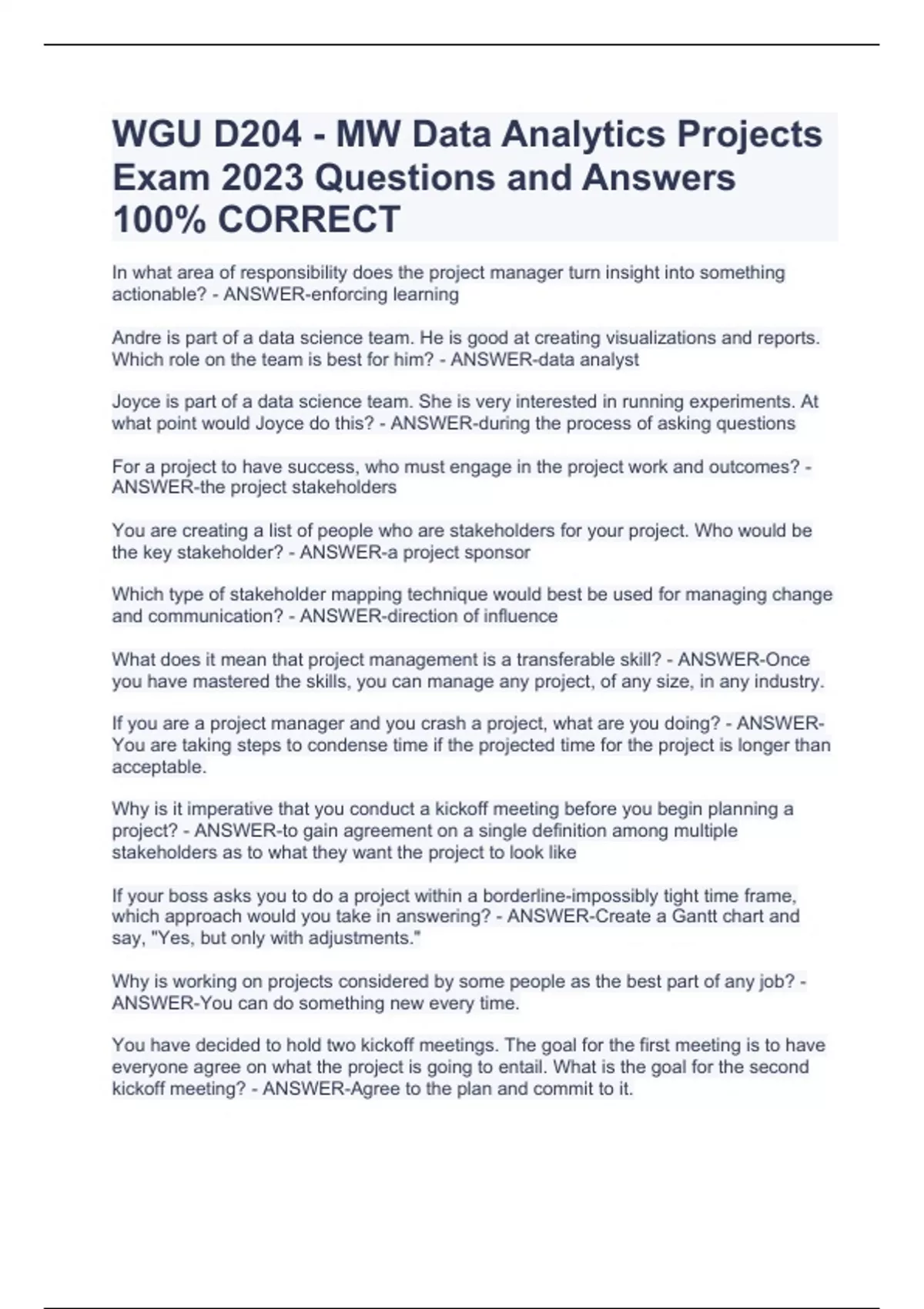 WGU D204 - MW Data Analytics Projects Exam 2023 Questions and Answers 100% CORRECTWGU D204 - MW Data Analytics Projects Exam 2023 Questions and Answers 100% CORRECTWGU D204 - MW Data Analytics Projects Exam 2023 Questions and Answers 100% CORRECT In what area of responsibility does the project manager turn insight into something actionable? - ANSWER-enforcing learning Andre is part of a data science team. He is good at creating visualizations and reports. Which role on the team is best for him? - ANSWER-data analyst Joyce is part of a data science team. She is very interested in running experiments. At what point would Joyce do this? - ANSWER-during the process of asking questions For a project to have success, who must engage in the project work and outcomes? - ANSWER-the project stakeholders