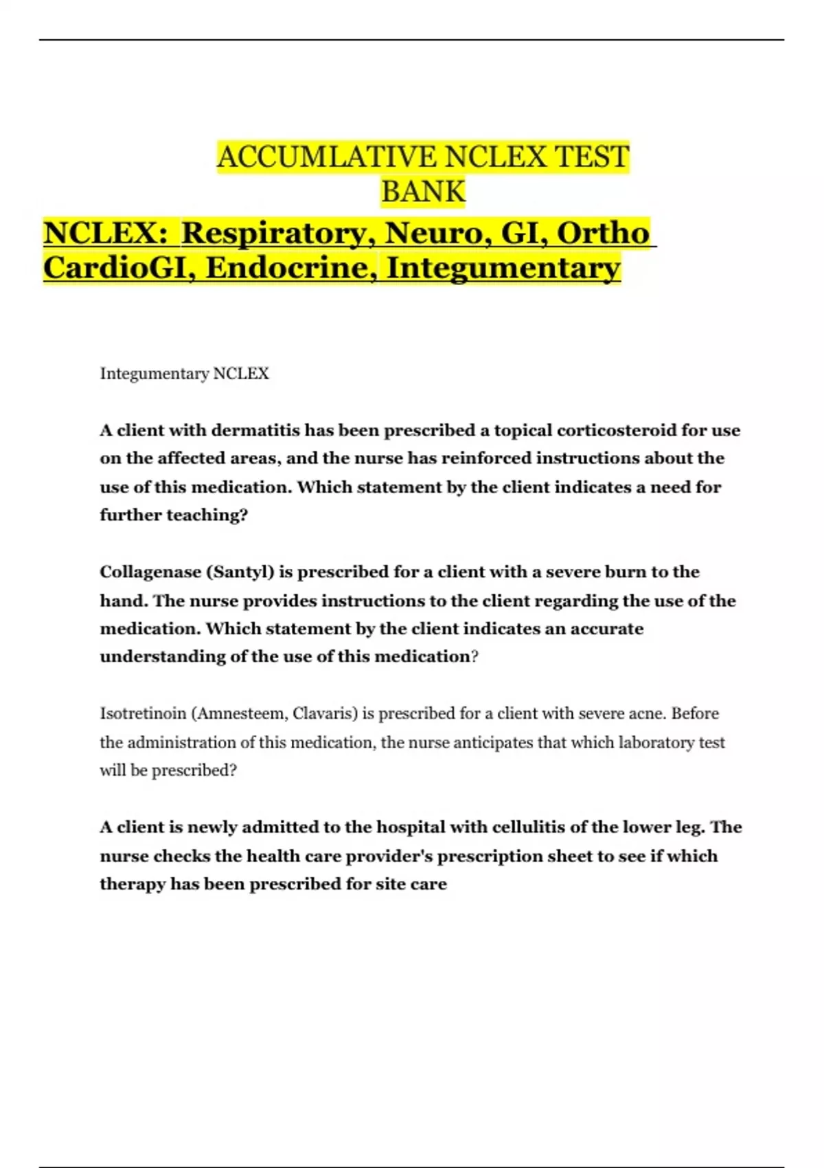 ACCUMLATIVE NCLEX TEST BANK NCLEX: Respiratory, Neuro, GI, Ortho CardioGI, Endocrine, Integumentary Integumentary NCLEX A client with dermatitis has been prescribed a topical corticosteroid for use on the affected areas, and the nurse has reinforced instructions about the use of this medication. Which statement by the client indicates a need for further teaching? Collagenase (Santyl) is prescribed for a client with a severe burn to the hand. The nurse provides instructions to the client regarding the use of the medication. Which statement by the client indicates an accurate understanding of the use of this medication? Isotretinoin (Amnesteem, Clavaris) is prescribed for a client with severe acne. Before the administration of this medication, the nurse anticipates that which laboratory test will be prescribed? A client is newly admitted to the hospital with cellulitis of the lower leg. The nurse checks the health care provider's prescription sheet to see if which therapy has been prescribed for site care A client with eczema has a prescription for a topical corticosteroid. The nurse cautions the client to use the product carefully in which area where the risk of systemic absorption is greater? The nurse is providing instructions to a client with a diagnosis of scabies regarding the administration of crotamiton (Eurax). Which statement by the client indicates an understanding regarding the application of this medication? The health care provider has prescribed silver sulfadiazine (Silvadene) for the client with a partial-thickness burn, which has cultured positive for gram-negative bacteria. The nurse is reinforcing information to the client about the medication. Which statement made by the client indicates a lack of understanding about the treatments? A client is seen in the clinic for complaints of skin itchiness that has been persistent over the past several weeks. Following data collection, it has been determined that the client has scabies. Lindane is prescribed, and the nurse is asked to provide instructions to the client regarding the use of the medication. How should the nurse teach the client to apply the cream? The nurse is applying a topical glucocorticoid on a client with eczema. The nurse monitors for systemic absorption of the medication if the medication is being applied to which body areas? Coal tar has been prescribed for a client with a diagnosis of psoriasis, and the nurse reinforces instructions to the client about the medication. Which statement by the client indicates a need for further teaching? Isotretinoin (Accutane) is prescribed for a client to treat severe cystic acne. The nurse tells the client that the length of the usual prescribed course of treatment is which? Mafenide acetate (Sulfamylon) is prescribed for the client with a burn injury. When applying the medication, the client complains of local discomfort and burning. Which is the most appropriate nursing action? The burn client is receiving treatments of topical mafenide acetate (Sulfamylon) to the site of injury. The nurse monitors the client knowing that which indicates a systemic effect has occurred? Collagenase (Santyl) is prescribed for a client with a severe burn to the hand. The nurse is preparing to reinforce instructions to the client and spouse regarding the wound treatment. Which directions should the nurse include in the instructions?