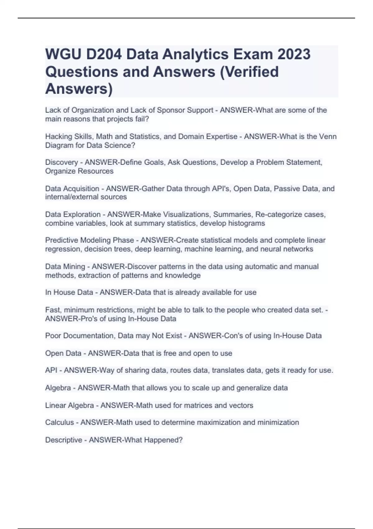 WGU D204 Data Analytics Exam 2023 Questions and Answers (Verified Answers)WGU D204 Data Analytics Exam 2023 Questions and Answers (Verified Answers)WGU D204 Data Analytics Exam 2023 Questions and Answers (Verified Answers) Lack of Organization and Lack of Sponsor Support - ANSWER-What are some of the main reasons that projects fail? Hacking Skills, Math and Statistics, and Domain Expertise - ANSWER-What is the Venn Diagram for Data Science? Discovery - ANSWER-Define Goals, Ask Questions, Develop a Problem Statement, Organize Resources Data Acquisition - ANSWER-Gather Data through API's, Open Data, Passive Data, and internal/external sources Data Exploration - ANSWER-Make Visualizations, Summaries, Re-categorize cases, combine variables, look at summary statistics, develop histograms Predictive Modeling Phase - ANSWER-Create statistical models and complete linear regression, decision trees, deep learning, machine learning, and neural networks Data Mining - ANSWER-Discover patterns in the data using automatic and manual methods, extraction of patterns and knowledge In House Data - ANSWER-Data that is already available for use Fast, minimum restrictions, might be able to talk to the people who created data set. - ANSWER-Pro's of using In-House Data Poor Documentation, Data may Not Exist - ANSWER-Con's of using In-House Data Open Data - ANSWER-Data that is free and open to use API - ANSWER-Way of sharing data, routes data, translates data, gets it ready for use. Algebra - ANSWER-Math that allows you to scale up and generalize data Linear Algebra - ANSWER-Math used for matrices and vectors Calculus - ANSWER-Math used to determine maximization and minimization Descriptive - ANSWER-What Happened?