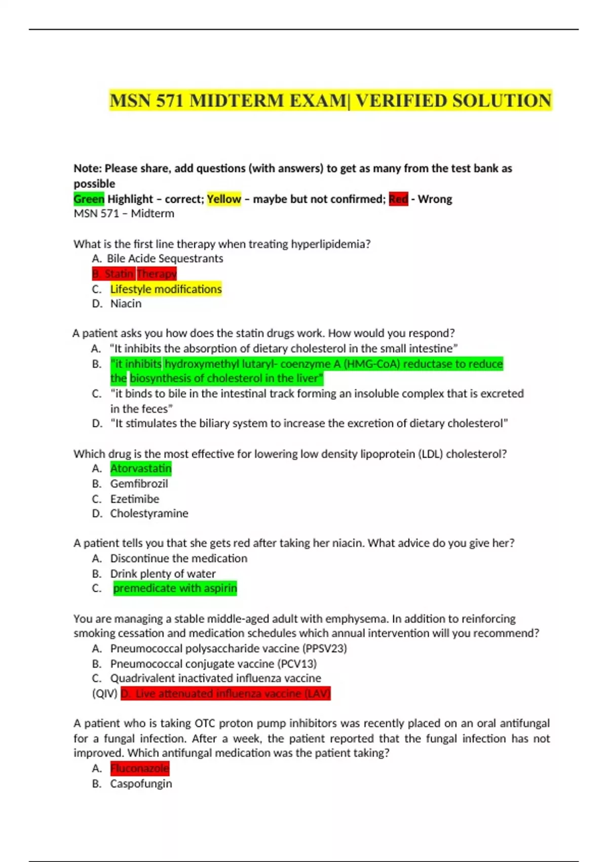 MSN 571 MIDTERM EXAM| VERIFIED SOLUTION Note: Please share, add questions (with answers) to get as many from the test bank as possible Green Highlight – correct; Yellow – maybe but not confirmed; Red - Wrong MSN 571 – Midterm What is the first line therapy when treating hyperlipidemia? A. Bile Acide Sequestrants B. Statin Therapy C. Lifestyle modifications D. Niacin A patient asks you how does the statin drugs work. How would you respond? A. “It inhibits the absorption of dietary cholesterol in the small intestine” B. “it inhibits hydroxymethyl lutaryl- coenzyme A (HMG-CoA) reductase to reduce the biosynthesis of cholesterol in the liver” C. “it binds to bile in the intestinal track forming an insoluble complex that is excreted in the feces” D. “It stimulates the biliary system to increase the excretion of dietary cholesterol” Which drug is the most effective for lowering low density lipoprotein (LDL) cholesterol? A. Atorvastatin B. Gemfibrozil C. Ezetimibe D. Cholestyramine A patient tells you that she gets red after taking her niacin. What advice do you give her? A. Discontinue the medication B. Drink plenty of water C. premedicate with aspirin You are managing a stable middle-aged adult with emphysema. In addition to reinforcing smoking cessation and medication schedules which annual intervention will you recommend?