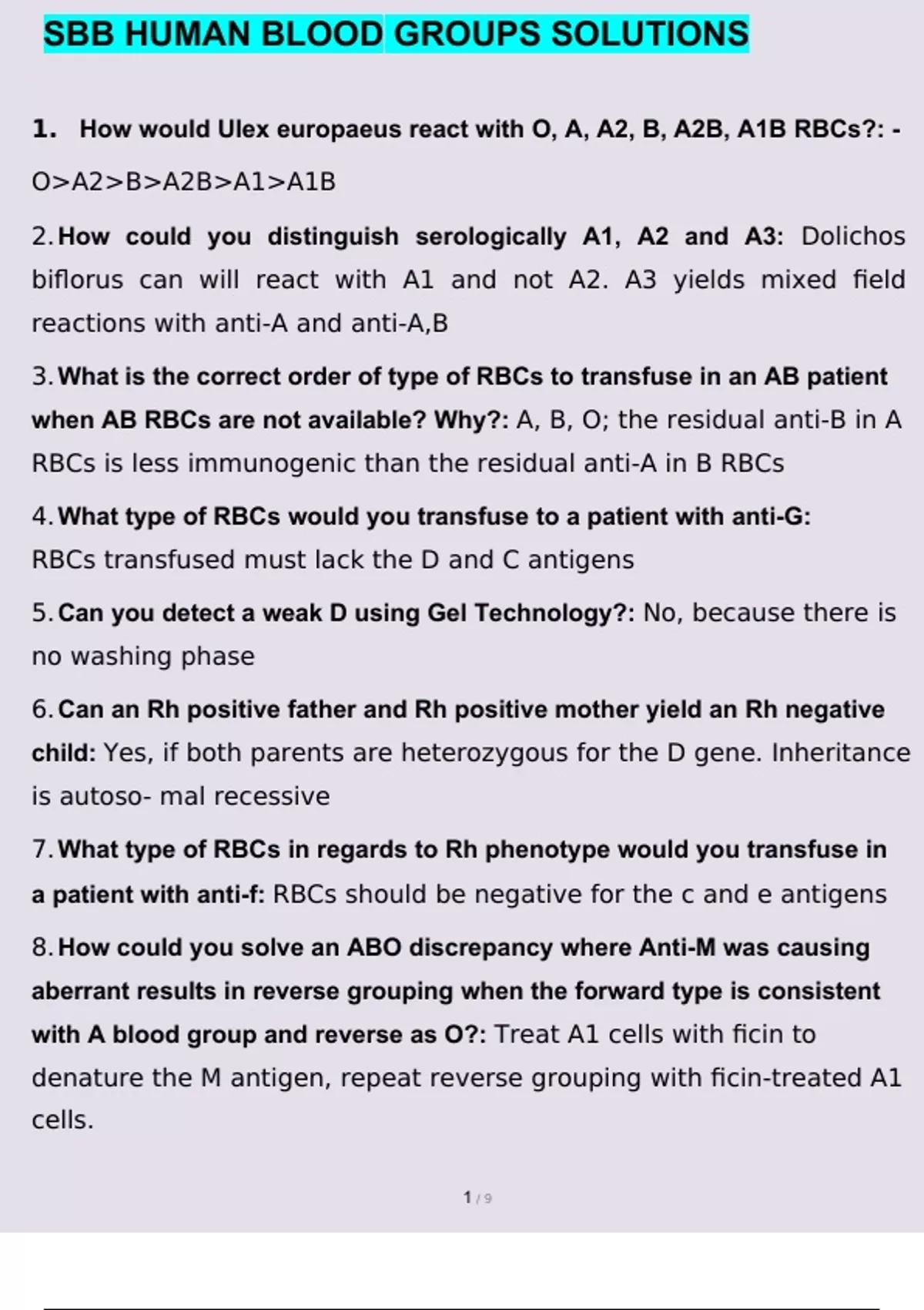 SBB HUMAN BLOOD GROUPS SOLUTIONS QUESTIONS AND ANSWERS A+ GRADED