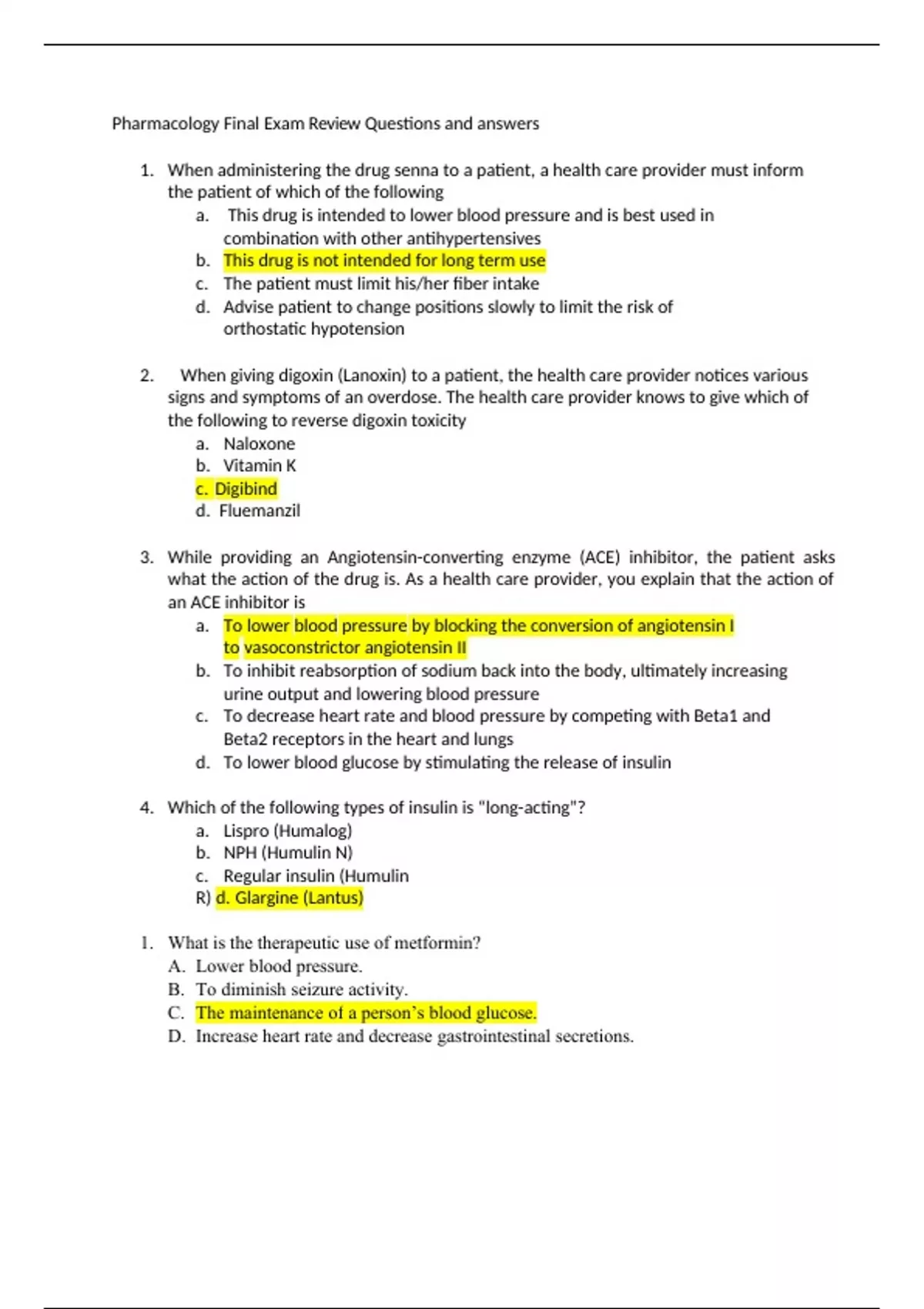 Pharmacology Final Exam Review Questions and answers 1. When administering the drug senna to a patient, a health care provider must inform the patient of which of the following a. This drug is intended to lower blood pressure and is best used in combination with other antihypertensives b. This drug is not intended for long term use c. The patient must limit his/her fiber intake d. Advise patient to change positions slowly to limit the risk of orthostatic hypotension 2. When giving digoxin (Lanoxin) to a patient, the health care provider notices various signs and symptoms of an overdose. The health care provider knows to give which of the following to reverse digoxin toxicity a. Naloxone b. Vitamin K c. Digibind d. Fluemanzil 3. While providing an Angiotensin-converting enzyme (ACE) inhibitor, the patient asks what the action of the drug is. As a health care provider, you explain that the action of an ACE inhibitor is a. To lower blood pressure by blocking the conversion of angiotensin I to vasoconstrictor angiotensin II b. To inhibit reabsorption of sodium back into the body, ultimately increasing urine output and lowering blood pressure c. To decrease heart rate and blood pressure by competing with Beta1 and Beta2 receptors in the heart and lungs d. To lower blood glucose by stimulating the release of insulin 4. Which of the following types of insulin is “long-acting”? a. Lispro (Humalog) b. NPH (Humulin N) c. Regular insulin (Humulin R) d. Glargine (Lantus) 1. What is the therapeutic use of metformin? A. Lower blood pressure. B. To diminish seizure activity. C. The maintenance of a person’s blood glucose. D. Increase heart rate and decrease gastrointestinal secretions.