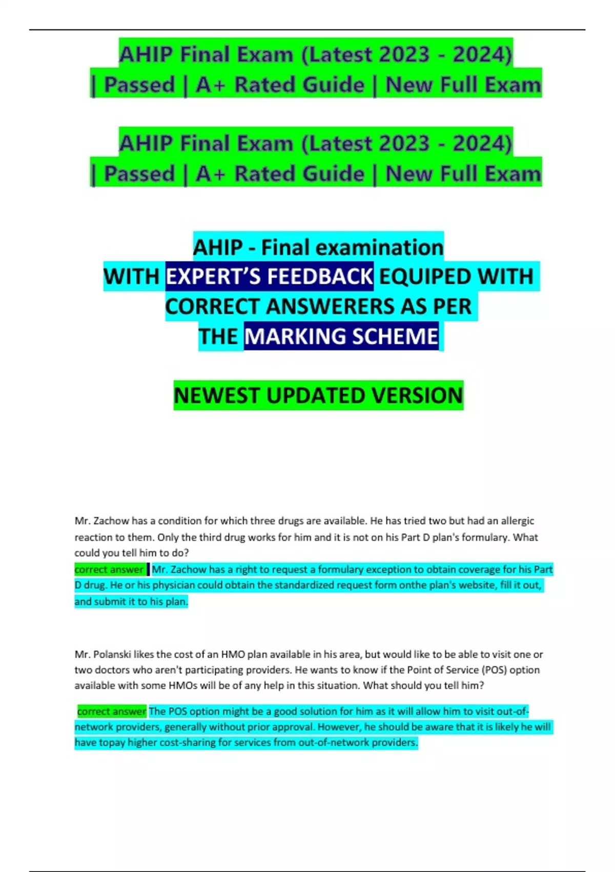 AHIP Final Exam (Latest ) | Passed | A+ Rated Guide | New Full Exam AHIP - Final examination WITH EXPERT’S FEEDBACK EQUIPED WITH CORRECT ANSWERERS AS PER THE MARKING SCHEME NEWEST UPDATED VERSION Mr. Zachow has a condition for which three drugs are available. He has tried two but had an allergic reaction to them. Only the third drug works for him and it is not on his Part D plan's formulary. What could you tell him to do? correct answer : Mr. Zachow has a right to request a formulary exception to obtain coverage for his Part D drug. He or his physician could obtain the standardized request form on the plan's website, fill it out, and submit it to his plan. Mr. Polanski likes the cost of an HMO plan available in his area, but would like to be able to visit one or two doctors who aren't participating providers. He wants to know if the Point of Service (POS) option available with some HMOs will be of any help in this situation. What should you tell him? correct answer The POS option might be a good solution for him as it will allow him to visit out-of-network providers, generally without prior approval. However, he should be aware that it is likely he will have to pay higher cost-sharing for services from out-of-network providers.