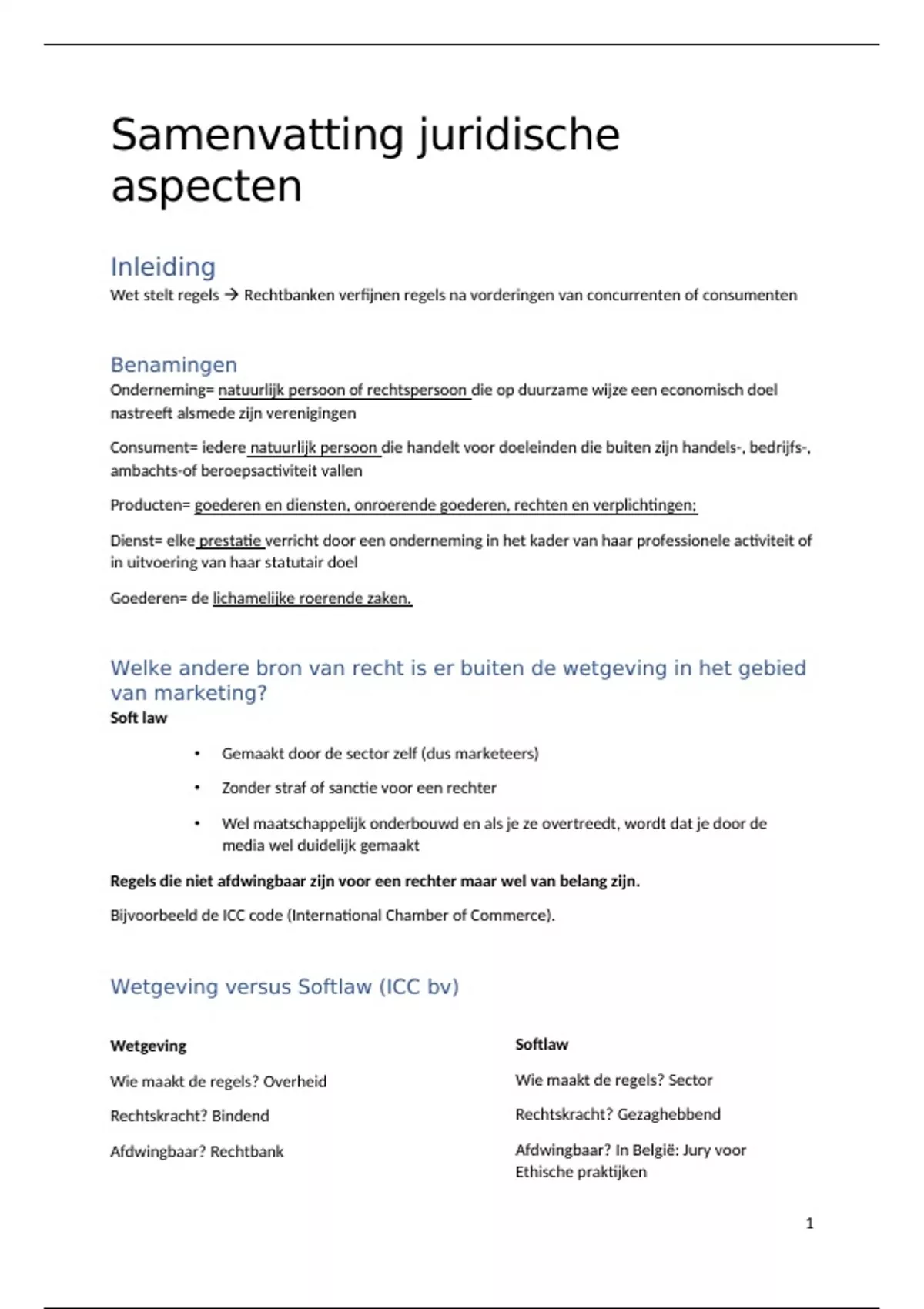 Samenvatting van 56 pagina's voor het vak Juridische Aspecten aan de KdG (17/20 behaald!)