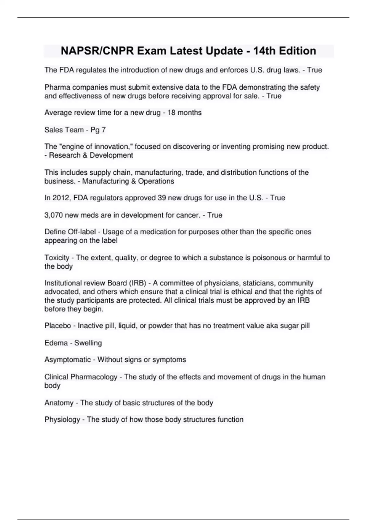 The FDA regulates the introduction of new drugs and enforces U.S. drug laws. - True Pharma companies must submit extensive data to the FDA demonstrating the safety and effectiveness of new drugs before receiving approval for sale. - True Average review time for a new drug - 18 months Sales Team - Pg 7 The "engine of innovation," focused on discovering or inventing promising new product. - Research & Development This includes supply chain, manufacturing, trade, and distribution functions of the business. - Manufacturing & Operations In 2012, FDA regulators approved 39 new drugs for use in the U.S. - True 3,070 new meds are in development for cancer. - True Define Off-label - Usage of a medication for purposes other than the specific ones appearing on the label Toxicity - The extent, quality, or degree to which a substance is poisonous or harmful to the body Institutional review Board (IRB) - A committee of physicians, staticians, community advocated, and others which ensure that a clinical trial is ethical and that the rights of the study participants are protected. All clinical trials must be approved by an IRB before they begin. Placebo - Inactive pill, liquid, or powder that has no treatment value aka sugar pill Edema - Swelling Asymptomatic - Without signs or symptoms Clinical Pharmacology - The study of the effects and movement of drugs in the human body Anatomy - The study of basic structures of the body Physiology - The study of how those body structures function