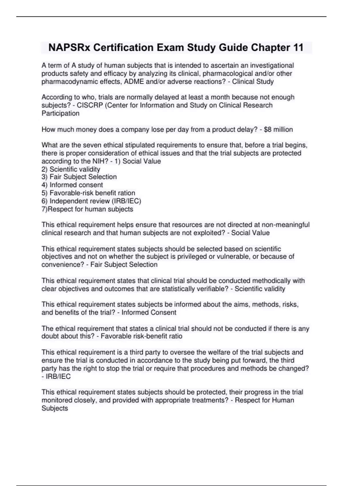 A term of A study of human subjects that is intended to ascertain an investigational products safety and efficacy by analyzing its clinical, pharmacological and/or other pharmacodynamic effects, ADME and/or adverse reactions? - Clinical Study According to who, trials are normally delayed at least a month because not enough subjects? - CISCRP (Center for Information and Study on Clinical Research Participation How much money does a company lose per day from a product delay? - $8 million What are the seven ethical stipulated requirements to ensure that, before a trial begins, there is proper consideration of ethical issues and that the trial subjects are protected according to the NIH? - 1) Social Value 2) Scientific validity 3) Fair Subject Selection 4) Informed consent 5) Favorable-risk benefit ration 6) Independent review (IRB/IEC) 7)Respect for human subjects This ethical requirement helps ensure that resources are not directed at non-meaningful clinical research and that human subjects are not exploited? - Social Value This ethical requirement states subjects should be selected based on scientific objectives and not on whether the subject is privileged or vulnerable, or because of convenience? - Fair Subject Selection This ethical requirement states that clinical trial should be conducted methodically with clear objectives and outcomes that are statistically verifiable? - Scientific validity This ethical requirement states subjects be informed about the aims, methods, risks, and benefits of the trial? - Informed Consent The ethical requirement that states a clinical trial should not be conducted if there is any doubt about this? - Favorable risk-benefit ratio This ethical requirement is a third party to oversee the welfare of the trial subjects and ensure the trial is conducted in accordance to the study being put forward, the third party has the right to stop the trial or require that procedures and methods be changed? - IRB/IEC This ethical requirement states subjects should be protected, their progress in the trial monitored closely, and provided with appropriate treatments? - Respect for Human Subjects