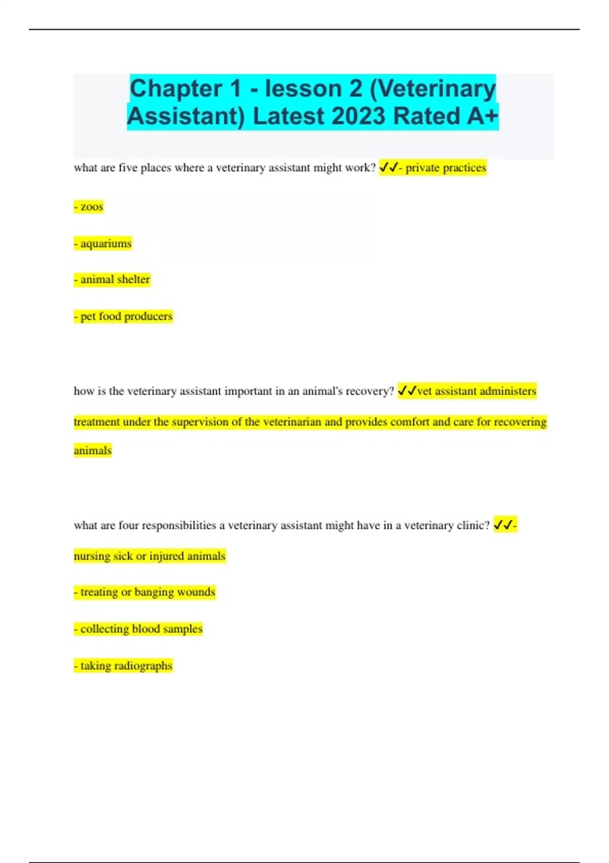 Chapter 1 - lesson 2 (Veterinary Assistant) Latest 2023 Rated A+ what are five places where a veterinary assistant might work? - private practices - zoos - aquariums - animal shelter - pet food producers how is the veterinary assistant important in an animal's recovery? vet assistant administers treatment under the supervision of the veterinarian and provides comfort and care for recovering animals what are four responsibilities a veterinary assistant might have in a veterinary clinic? - nursing sick or injured animals - treating or banging wounds - collecting blood samples - taking radiographs describe the responsibilities a veterinary assistant might have at a diagnostic laboratory the vet assistant is responsible for taking blood, fecal, and urine samples for testing. the vet assistant prepares the samples for microscopic examination, recognizes the morphology of bacteria, and detects the presence of parasites describe the responsibilities of a vet assistant in an ambulatory veterinary practice a vet assistnat is responsible for ensuring the veterinarian has access to the emergency tools and medications. they are also responsible for restraining the animal what responsibilities might a vet assistant have at a zoo? perform routine treatments under the supervision of a vet. they supply the vet with tools and medications in emergencies and direct restraint what responsibilities might a vet assistant have at an aquarium? restraint and monitoring the behavior of the animals why is it important that a vet assistant know how to preform microscopic examinations of bacteria? identify various bacteria why is it important that a vet assistant be able to recognize certain types of animal behavior? the animal's behavior provides signals to handlers indicating distress, recovery, as well as clues to the animals state of mind what are five skills that would be useful to a vet assistant? - radiography - knowledge of animal behavior - sample collection skills - nursing skills -microscopy what is required for a person to become a registered veterinary technician? the individual must earn an associate of applied science degree and pass state and national exams