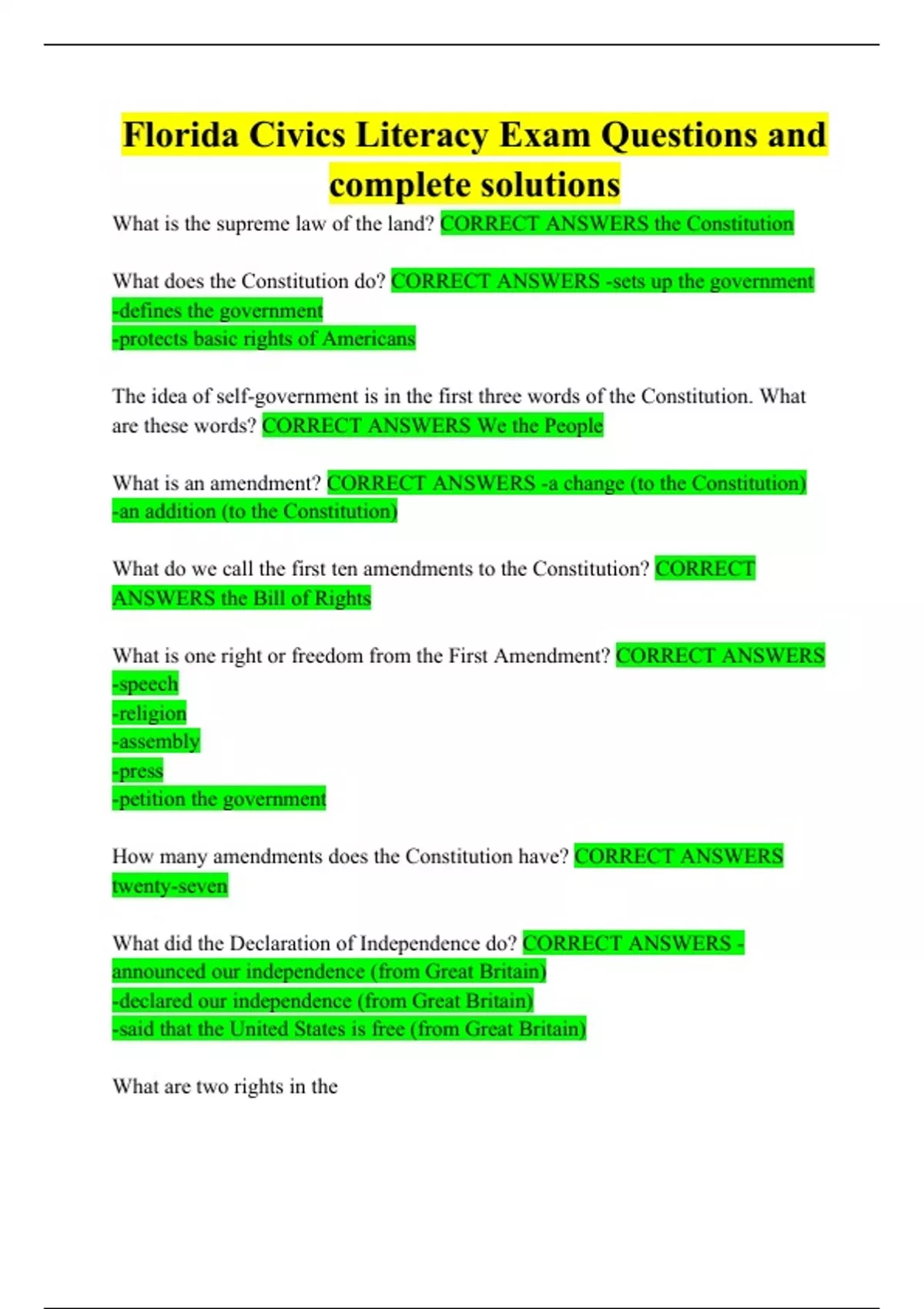 Florida Civics Literacy Exam Questions and complete solutions What is the supreme law of the land? What does the Constitution do? The idea of self-government is in the first three words of the Constitution. What are these words? What is an amendment? What do we call the first ten amendments to the Constitution? What is one right or freedom from the First Amendment? How many amendments does the Constitution have? What did the Declaration of Independence do? What are two rights in the Declaration of Independence? What is freedom of religion? What is the economic system in the United States? What is the "rule of law"? Name one branch or part of the government. What stops one branch of government from becoming too powerful? Who is in charge of the executive branch?