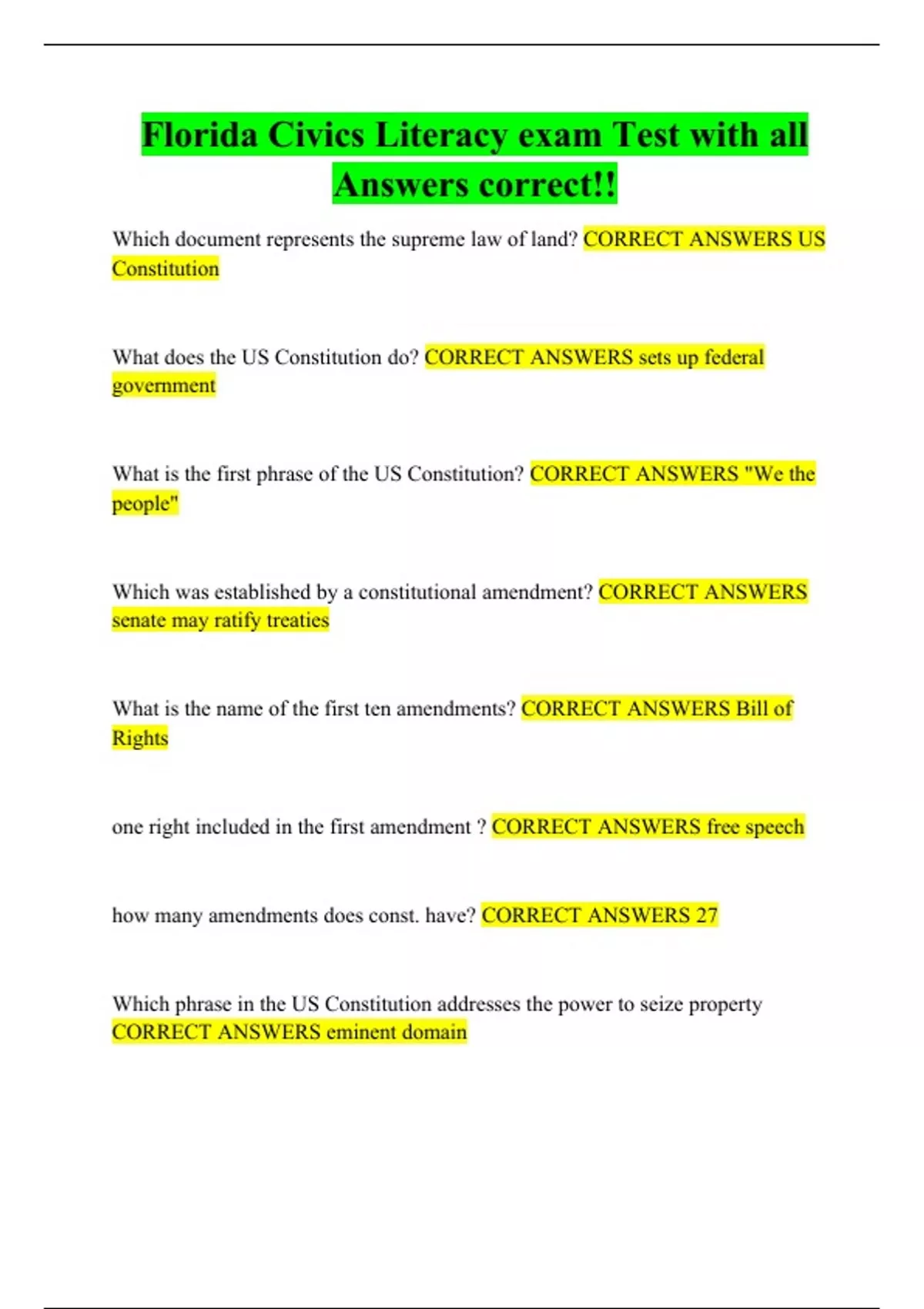 Florida Civics Literacy exam Test with all Answers correct!! Which document represents the supreme law of land? What does the US Constitution do? What is the first phrase of the US Constitution? Which was established by a constitutional amendment? What is the name of the first ten amendments? one right included in the first amendment ? how many amendments does const. have? Which phrase in the US Constitution addresses the power to seize property What is one branch of the US federal government Who is in charge of the executive branch Who signs proposed bills into federal laws What is one chamber of the US Congress How many US senators represent each state What is the length of the US senators elected term What is one power of the US Senate What is the length of the US representative elected term What is the age qualification to serve as a member of the US House of Representatives?