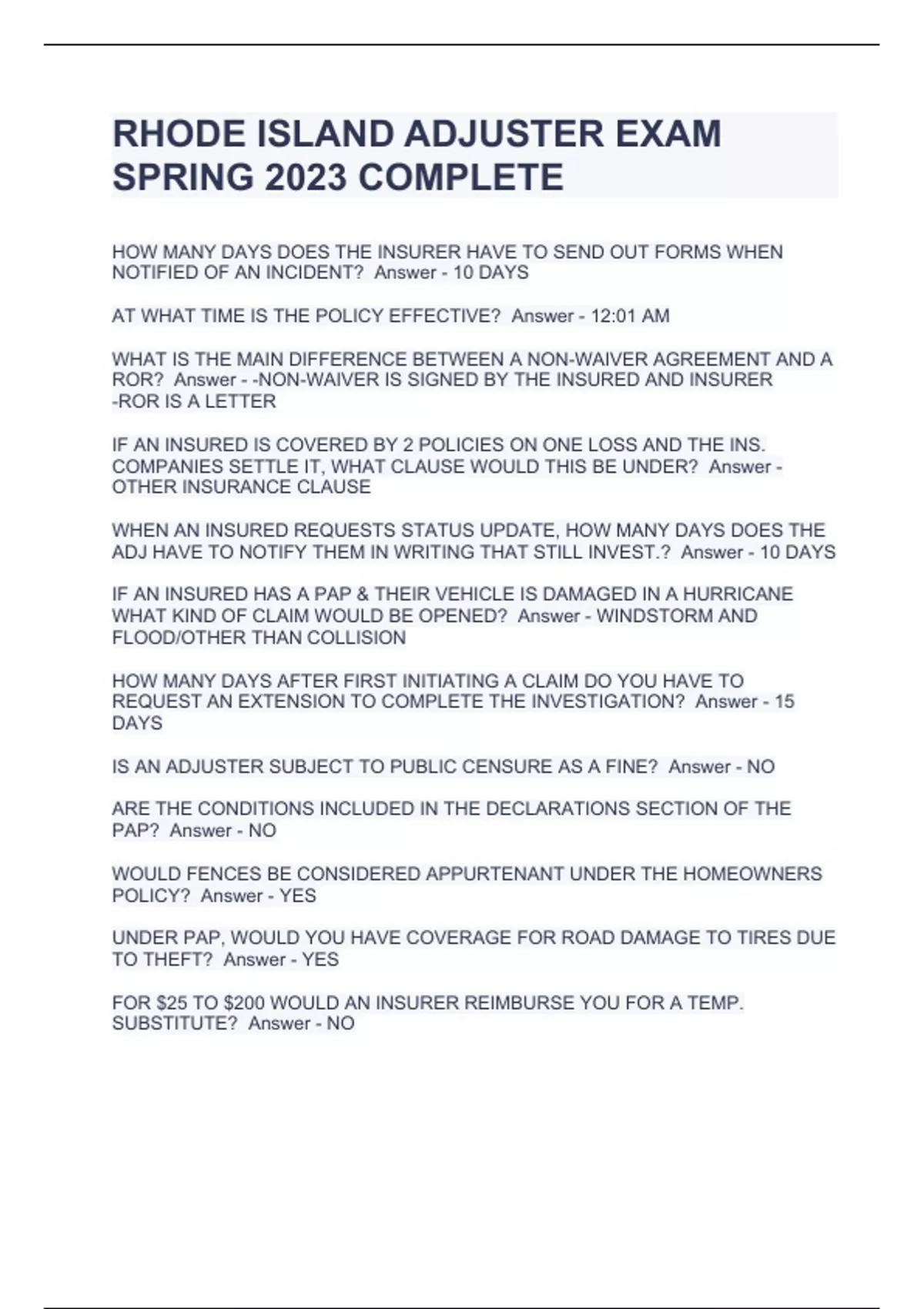 RHODE ISLAND ADJUSTER EXAM SPRING 2023 COMPLETE