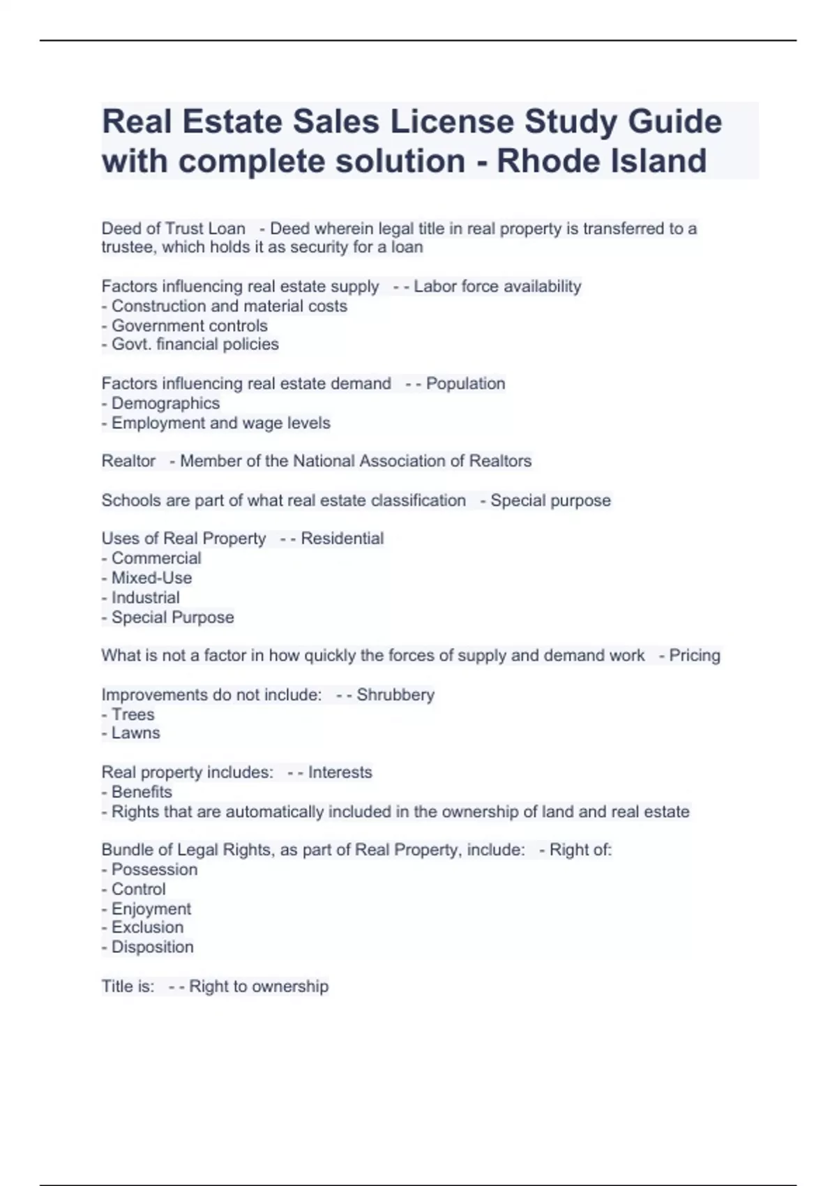 Real Estate Sales License Study Guide with complete solution - Rhode Island