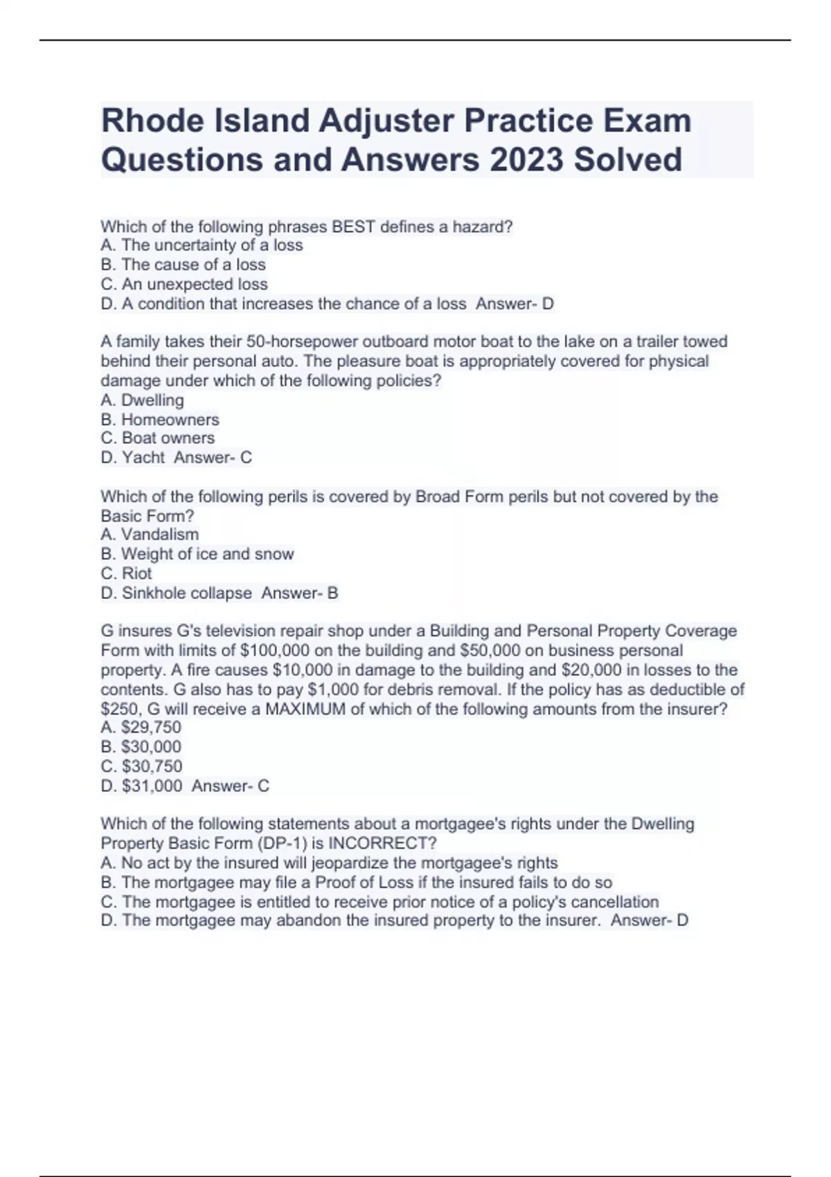 Rhode Island Adjuster Practice Exam Questions and Answers 2023 Solved