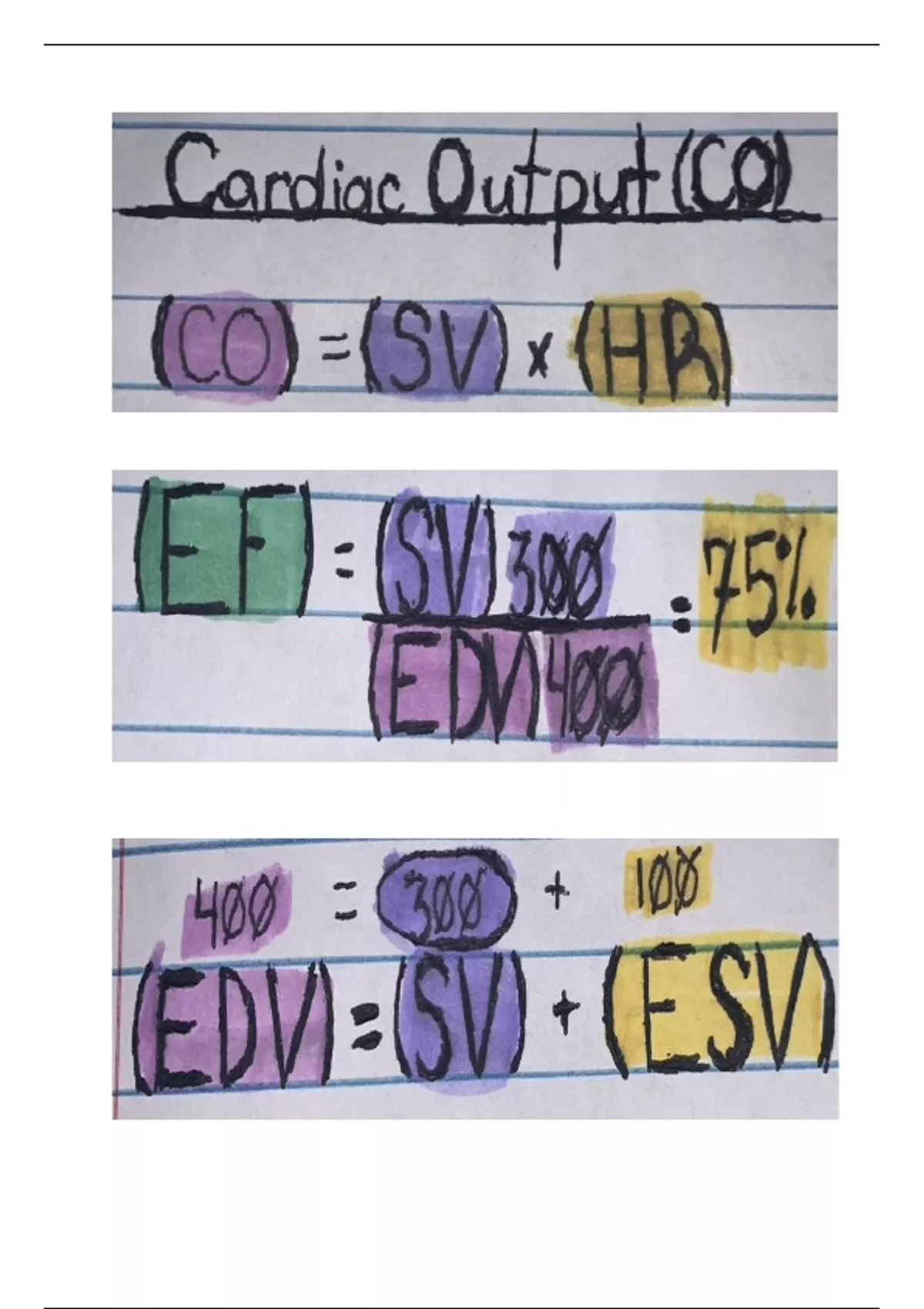 the volumetric flow rate of the heart's pumping output: that is, the volume of blood being pumped by a single ventricle of the heart, per unit time. Stroke Volume (SV) *x* Heart Rate (HR) = Cardiac Output End-Systolic Volume (ESV) *+* Stroke Volume (SV) = End-Diastolic Volume (EDV) Stroke Volume (SV) */* End-Diastolic Volume (EDV) = Ejection Fraction (EF)