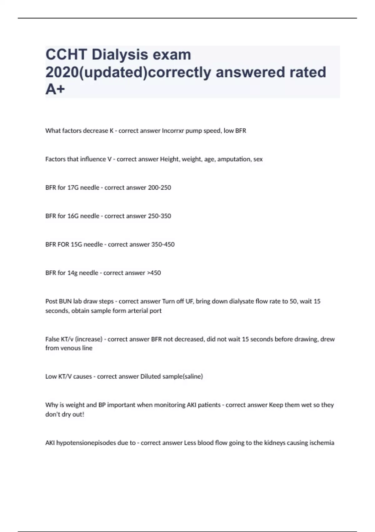CCHT Dialysis exam 2020(updated)correctly answered rated A+What factors decrease K Incorrxr pump speed, low BFR Factors that influence V Height, weight, age, amputation, sex BFR for 17G needle 200-250 BFR for 16G needle 250-350 BFR FOR 15G needle 350-450 BFR for 14g needle >450 Post BUN lab draw steps Turn off UF, bring down dialysate flow rate to 50, wait 15 seconds, obtain sample form arterial port False KT/v (increase) BFR not decreased, did not wait 15 seconds before drawing, drew from venous line Low KT/V causes Diluted sample(saline) Why is weight and BP important when monitoring AKI patients Keep them wet so they don't dry out! AKI hypotensionepisodes due to Less blood flow going to the kidneys causing ischemia Why is it important to know what caused PT chronic renal failure? So we can treat complications and zone in on things during data collection When is a pre-treatment assessment by the licensed nurse required? AKI patients or state mandate DQI purpose A way for facilities to measure performance to improve our Pt quality of life When is it okay for a PT to be released from TX Evaluate effectiveness of the Tx, and compare pre Tx to post Tx 4 reasons why we document on a medical record 1. Proof care was rendered 2. Provides data continuity 3. Permanent legal record 4. Communication tool When to chart Medication given, and Pt response Times for documentation Pre and post tx REM may be seen on the test as AOR Consequence of sodium overloading Increased thirst, increased fluid weight gain, higher UF rate, more hypotension Foods high in phosphorus Chocolate, dairy products, legumes, dark pop Binders work by Prevention of absorption in the gut(remember magnet) Diffusion Higher to lower concentration (down) Osmosis Lower to higher, opposite of diffusion Movement of bicarb from dialysate to blood Helps normalize body's PH Bicarb in dialysate acts as a BUFFER