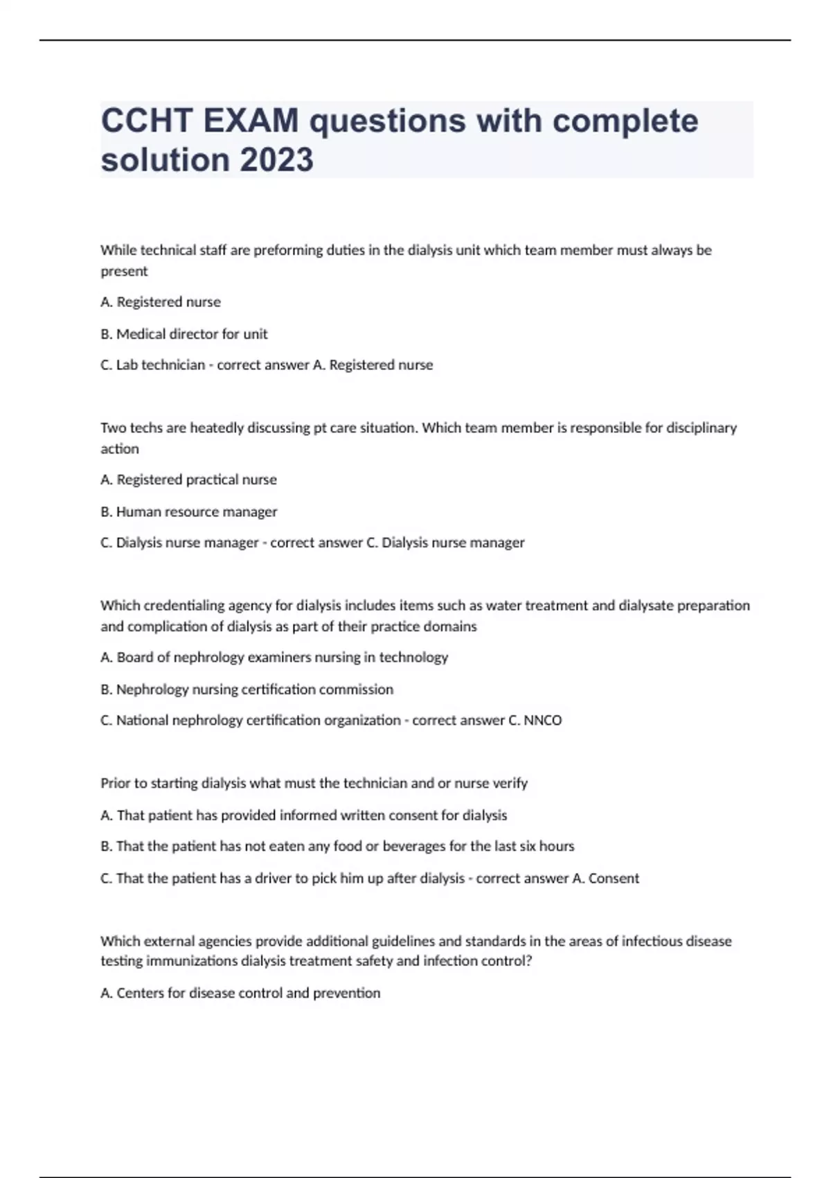 CCHT EXAM questions with complete solution 2023While technical staff are preforming duties in the dialysis unit which team member must always be present A. Registered nurse B. Medical director for unit C. Lab technician - correct answer A. Registered nurse Two techs are heatedly discussing pt care situation. Which team member is responsible for disciplinary action A. Registered practical nurse B. Human resource manager C. Dialysis nurse manager - correct answer C. Dialysis nurse manager Which credentialing agency for dialysis includes items such as water treatment and dialysate preparation and complication of dialysis as part of their practice domains A. Board of nephrology examiners nursing in technology B. Nephrology nursing certification commission C. National nephrology certification organization - correct answer C. NNCO Prior to starting dialysis what must the technician and or nurse verify A. That patient has provided informed written consent for dialysis B. That the patient has not eaten any food or beverages for the last six hours C. That the patient has a driver to pick him up after dialysis - correct answer A. Consent Which external agencies provide additional guidelines and standards in the areas of infectious disease testing immunizations dialysis treatment safety and infection control? A. Centers for disease control and prevention B. Centers for Medicare and Medicaid service C. Association for the advancement of medical instrumentation D. Council of nephrology - correct answer A B and C Prior to passing the Social Security amendments treatment for chronic kidney disease was available only to few who met certain criteria. The amendments extended Medicare coverage for almost all patients who signed the amendment and then what year A. Jimmy Carter in 1979 B. Richard Nixon 1972 C. John f Kennedy 1961 - correct answer B. Richard Nixon 1972 Which organization recently approved by CMS to be an independent organization allowed to conduct surveys for Medicare certification fostering faster approval for dialysis clinics A. National kidney foundation B. Medicare bundle dialysis prospective payment system C. National dialysis accreditation commission - correct answer C. NDAC What is the composition of saline A. 10% salt added to water B. Albumin C. 0.9g of sodium chloride and 100ml of water - correct answer C. 0.9g of sodium and 100ml of h2o When caring for a patient if the dialysate solution contains two little sodium the water may shift into the patient's blood cells which signs or symptoms would you see A. Hypotension B. Cramping C. Thirst D. Headache - correct answer A and B Which buffer is the major plasma buffer therefor important during dialysis