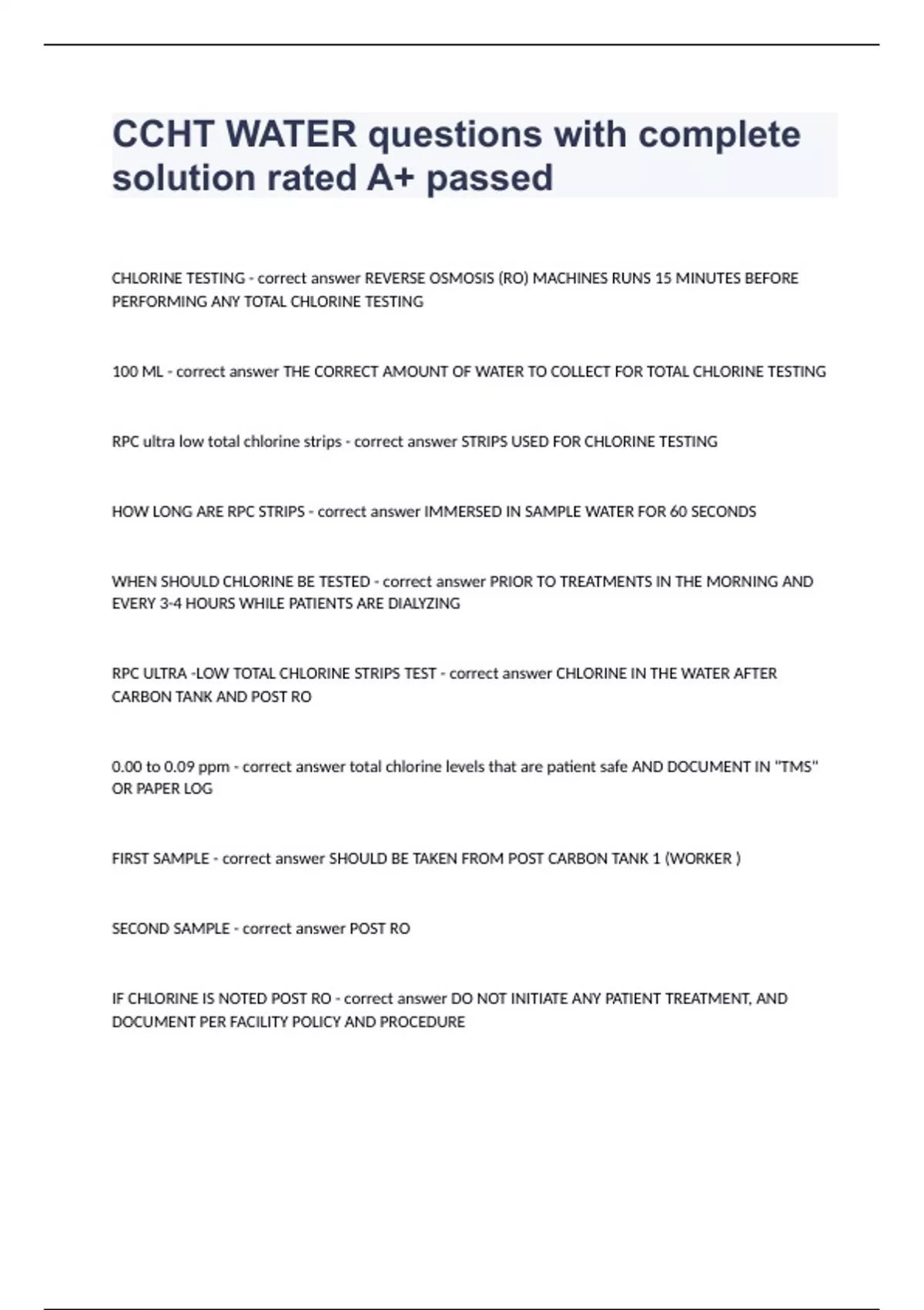 CCHT WATER questions with complete solution rated A+ passed CHLORINE TESTING - correct answer REVERSE OSMOSIS (RO) MACHINES RUNS 15 MINUTES BEFORE PERFORMING ANY TOTAL CHLORINE TESTING 100 ML - correct answer THE CORRECT AMOUNT OF WATER TO COLLECT FOR TOTAL CHLORINE TESTING RPC ultra low total chlorine strips - correct answer STRIPS USED FOR CHLORINE TESTING HOW LONG ARE RPC STRIPS - correct answer IMMERSED IN SAMPLE WATER FOR 60 SECONDS WHEN SHOULD CHLORINE BE TESTED - correct answer PRIOR TO TREATMENTS IN THE MORNING AND EVERY 3-4 HOURS WHILE PATIENTS ARE DIALYZING RPC ULTRA -LOW TOTAL CHLORINE STRIPS TEST - correct answer CHLORINE IN THE WATER AFTER CARBON TANK AND POST RO 0.00 to 0.09 ppm - correct answer total chlorine levels that are patient safe AND DOCUMENT IN "TMS" OR PAPER LOG FIRST SAMPLE - correct answer SHOULD BE TAKEN FROM POST CARBON TANK 1 (WORKER ) SECOND SAMPLE - correct answer POST RO IF CHLORINE IS NOTED POST RO - correct answer DO NOT INITIATE ANY PATIENT TREATMENT, AND DOCUMENT PER FACILITY POLICY AND PROCEDURE CHLORINE BREAKTHROUGH - correct answer OCCURS POST CARBON TANK 1 (WORKER), IMMEDIATE ADDITIONAL TESTING SHOULD TAKE PLACE AFTER CARBON TANK 2 (POLISHER) CARBON TANK 2 (POLISHER) - correct answer IF TANK SHOWS RESULTS ABOVE THE ACTION LEVEL IMMEDIATELY STOP TREATMENTS BYPASS - correct answer YOU WILL PUT PATIENTS IN THIS IF CARBON TANK 2 (POLISHER) TEST POSTIVE FOR CHLORINE , DOCUMENT TMS OR TCL- 2 LOG EVERY 2 HOURS MEDICAL DIRECTOR - correct answer AFTER CHLORINE BREAKTHROUGH , WHO MUST APPROVE TO RESUME NORMAL OPERATION AND SIGN INTO TMS OR TCL -2 LOG WHO TO NOTIFY IF CHLORINE BREAKTHROUGH - correct answer CLINICAL MANAGER, TECHNICAL SERVICES , MEDICAL DIRECTOR AND DIRECTOR OF OPERATIONS WATER HARDNESS - correct answer WATER EXISTING THE WATER SOFTENR PARTS PER MILLION (PPM) - correct answer HOW WATER HARDNESS IS MEASURED 20 PPM - correct answer ACCEPTABLE LIMITS FOR WATER HARDNESS POST SOFTNER HOW OFTEN WATER SOFTNER TEST DONE - correct answer THERE ARE 2 WATER HARDNESS TEST DONE DAILY, UNDER NORMAL OPERATING CONDITIONS HARDNES STRIPS TEST FOR - correct answer CALCIUM AND MAGNESIUM SAMPLE CONTAINERS ARE - correct answer RINSED 3 TIMES BEFORE A SAMPLE IS COLLECTED FOR TESTING CONDUCTIVITY METETR - correct answer PHOENIX OR MYRON METER L