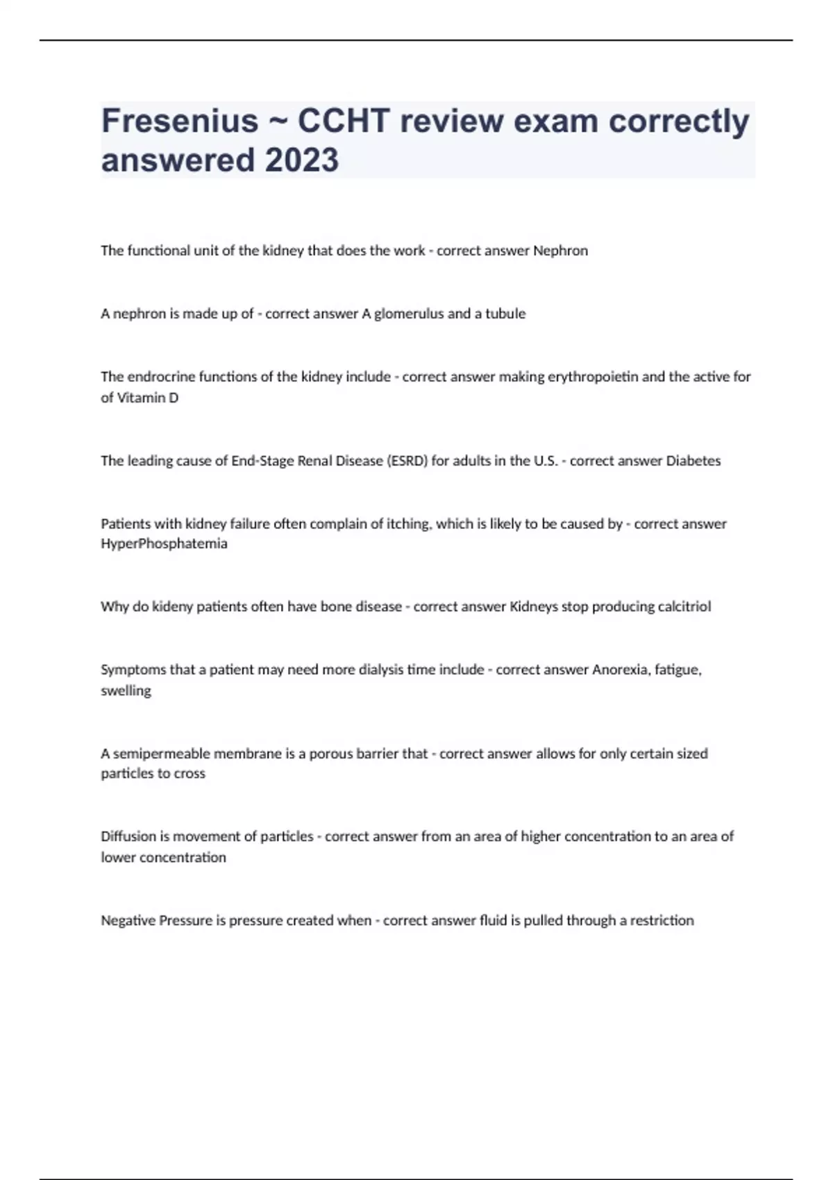 Fresenius ~ CCHT review exam correctly answered 2023The functional unit of the kidney that does the work - correct answer Nephron A nephron is made up of - correct answer A glomerulus and a tubule The endrocrine functions of the kidney include - correct answer making erythropoietin and the active for of Vitamin D The leading cause of End-Stage Renal Disease (ESRD) for adults in the U.S. - correct answer Diabetes Patients with kidney failure often complain of itching, which is likely to be caused by - correct answer HyperPhosphatemia Why do kideny patients often have bone disease - correct answer Kidneys stop producing calcitriol Symptoms that a patient may need more dialysis time include - correct answer Anorexia, fatigue, swelling A semipermeable membrane is a porous barrier that - correct answer allows for only certain sized particles to cross Diffusion is movement of particles - correct answer from an area of higher concentration to an area of lower concentration Negative Pressure is pressure created when - correct answer fluid is pulled through a restriction During Dialysis, ultrafiltration occurs when - correct answer Water is removed from the blood because there is a pressure gradient between blood and dialysate at which point in the extracorporeal circuit is the blood usually under negative pressure - correct answer The arterial line section before the blood pump Which of the following will increase the amount of the solutes that will diffuse across the semipermeable membrane - correct answer High concentration gradients The components of the dialysate treatment that affect clearance include - correct answer Dialysate flow, time of treatment, dialyzer size, blood flow rate Two things that affect the dialyzer's ability to remove wastes from the body include - correct answer Surface area and molecular weight cutoff Dialysate is the fluid that helps remove waste products from the body. It contains a number of substances. What might be prescribed for a dialysate solution - correct answer Bicarbonate, Sodium, Potassium What is the most important safety monitor during a dialysis treatment - correct answer The dialysis technician Dialysate conductivity measures - correct answer the total electrical charge of a solution Dialysate that has too much sodium may cause patient injury. Too much sodium or hypernatremia can cause - correct answer Headaches, high blood pressure, and shriveling of the red blood cells Dialysate that has too much calcium can cause - correct answer Vomiting, confusion, irritability Dialysate that has too little sodium can cause - correct answer low blood pressure, cramping, and bursting of Red Blood Cells
