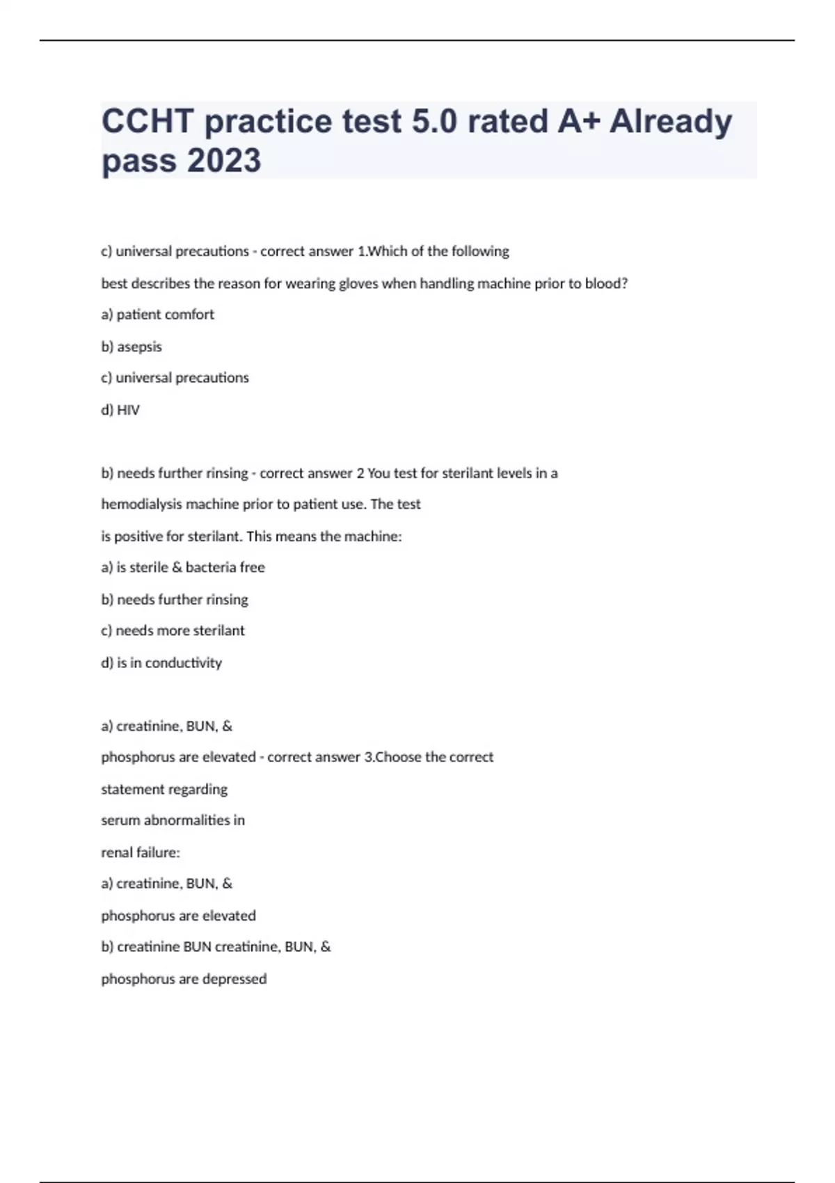 CCHT practice test 5.0 rated A+ Already pass 2023c) universal precautions - correct answer 1.Which of the following best describes the reason for wearing gloves when handling machine prior to blood? a) patient comfort b) asepsis c) universal precautions d) HIV b) needs further rinsing - correct answer 2 You test for sterilant levels in a hemodialysis machine prior to patient use. The test is positive for sterilant. This means the machine: a) is sterile & bacteria free b) needs further rinsing c) needs more sterilant d) is in conductivity a) creatinine, BUN, & phosphorus are elevated - correct answer 3.Choose the correct statement regarding serum abnormalities in renal failure: a) creatinine, BUN, & phosphorus are elevated b) creatinine BUN creatinine, BUN, & phosphorus are depressed c) calcium & bicarbonate are elevated d) calcium & bicarbonate are depressed a) vascular access - correct answer 4.Hemodialysis requires a means to channel the patient's blood to the hemodialyzer & then back to the body. It's called: a) vascular access b) hemodialyzer c) dialyzing fluid delivery system d) infusion pump b) usually created in the forearm, near the wrist - correct answer 5.Which of the following is correct regarding a fistula? a) usually created in the leg, near the ankle b) usually created in the forearm, near the wrist c) are made of salastic tubing d) none of the above c) blood leakage immediately - correct answer 6.Blood leak detectors are extremely sensitive & can determine: a) blood type b) amount of blood loss c) blood leakage immediately d) volume changes e) serum potassium levels d) bananas, tomatoes, oranges - correct answer 7.Which of the following foods are high in potassium? a) milk, ice cream, yogurt b) legumes, cheese, pizza c) chips, colas, canned meat d) bananas, tomatoes, oranges a) calcium, phosphorus & PTH - correct answer 8.What lab values are monitored for assessing bone disease? a) calcium, phosphorus & PTH b) calcium, phosphorus & albumin c) calcium, phosphorus & potassium d) calcium, phosphorus & magnesium a) diabetes - correct answer 9.Which is the most common cause of chronic kidney failure in the US? a) diabetes