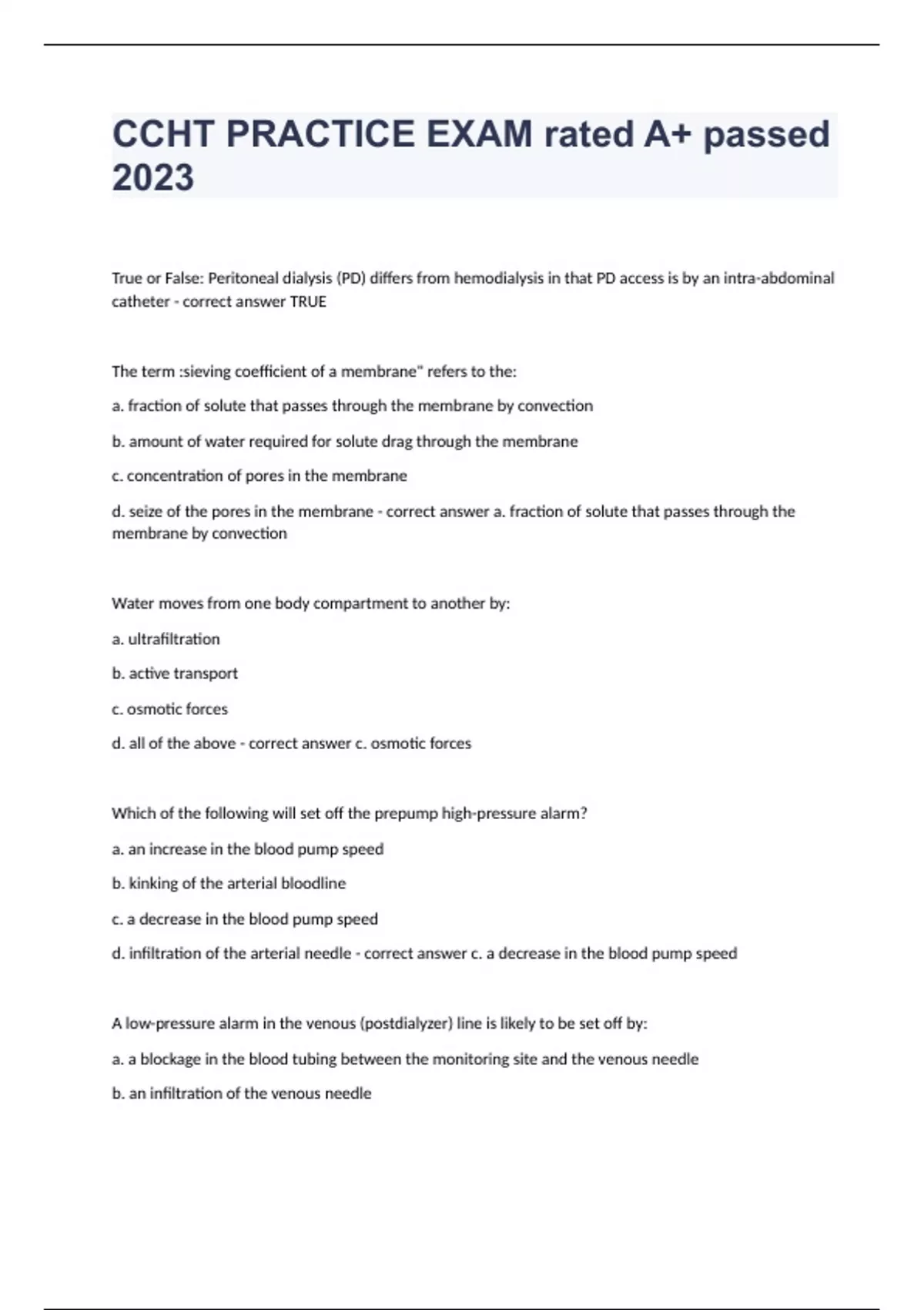 CCHT PRACTICE EXAM rated A+ passed 2023True or False: Peritoneal dialysis (PD) differs from hemodialysis in that PD access is by an intra-abdominal catheter - correct answer TRUE The term :sieving coefficient of a membrane" refers to the: a. fraction of solute that passes through the membrane by convection b. amount of water required for solute drag through the membrane c. concentration of pores in the membrane d. seize of the pores in the membrane - correct answer a. fraction of solute that passes through the membrane by convection Water moves from one body compartment to another by: a. ultrafiltration b. active transport c. osmotic forces d. all of the above - correct answer c. osmotic forces Which of the following will set off the prepump high-pressure alarm? a. an increase in the blood pump speed b. kinking of the arterial bloodline c. a decrease in the blood pump speed d. infiltration of the arterial needle - correct answer c. a decrease in the blood pump speed A low-pressure alarm in the venous (postdialyzer) line is likely to be set off by: a. a blockage in the blood tubing between the monitoring site and the venous needle b. an infiltration of the venous needle c. a clot in the venous access d. a blockage in the blood tubing before the monitoring site - correct answer d. a blockage in the blood tubing before the monitoring site Which of the following statements about an air detector is correct? a. it is present in the predialyzer blood tubing b. it uses an ultrasonic device to detect air in the blood path c. it sets off an alarm and clamps the predialyzer blood tubing d. all of the above statements are correct - correct answer b. it uses an ultrasonic device to detect air in the blood path How is the anticoagulant heparin given during the dialysis treatment? a. intermittently b. as a single bolus c. by continuous infusion d. by all of the above ways - correct answer d. by all of the fabove ways The main difference between an arteriovenous shunt (AVS) and an arteriovenous fistula (AVF) is... - correct answer AVF is entirely within the arm Biocompatibility is best illustrated by: a. synthetic membranes that do not absorb blood proteins as well as cellulose membranes b. independence from protein adsorption of the membrane c. reprocessed dialyzers that have a lower biocompatibility than new ones d. reprocessed dialyzers that have a better biocompatibility than new ones - correct answer d. reprocessed dialyzers that have a better biocompatibility than new ones The amount of fluid to be taken from the patient during hemodialysis: a. is independent of the filtration pressure b. requires the dialysate to have a higher pressure than the blood c. may be calculated by subtracting the patient's estimated dry weight from the predialysis weight and adding any fluid the patient receives during treatment d. may be calculated by adding the patient's predialysis weight and the amount of fluid the patient receives during treatment - correct answer c. may be calculated by subtracting the patient's estimated dry weight from the predialysis weight and adding any fluid the patient receives during treatment The ultra filtration coefficient of a dialyzer refers to the: a. fluid that passes through the membrane in 1 hour b. pressure in the blood compartment needed to force fluid through the membrane c. pressure difference across the membrane d. fluid that passes through the membrane in 1 minute - correct answer a fluid that passes through the membrane in 1 hour