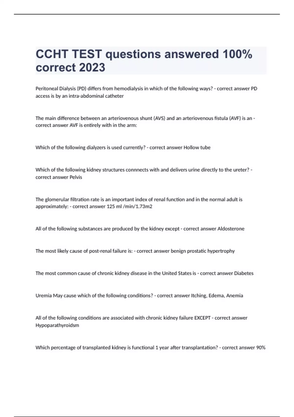 CCHT TEST questions answered 100% correct 2023Peritoneal Dialysis (PD) differs from hemodialysis in which of the following ways? - correct answer PD access is by an intra-abdominal catheter The main difference between an arteriovenous shunt (AVS) and an arteriovenous fistula (AVF) is an - correct answer AVF is entirely with in the arm: Which of the following dialyzers is used currently? - correct answer Hollow tube Which of the following kidney structures connnects with and delivers urine directly to the ureter? - correct answer Pelvis The glomerular filtration rate is an important index of renal function and in the normal adult is approximately: - correct answer 125 ml /min/1.73m2 All of the following substances are produced by the kidney except - correct answer Aldosterone The most likely cause of post-renal failure is: - correct answer benign prostatic hypertrophy The most common cause of chronic kidney disease in the United States is - correct answer Diabetes Uremia May cause which of the following conditions? - correct answer Itching, Edema, Anemia All of the following conditions are associated with chronic kidney failure EXCEPT - correct answer Hypoparathyroidsm Which percentage of transplanted kidney is functional 1 year after transplantation? - correct answer 90% Which hemodialysis schedule is likely to be the most efficient? - correct answer Short daily home hemodialysis, 2-3 hours a session, 5-7 days a week The fluid restriction for most patients undergoing in-center hemodialysis is equal to urine - correct answer 1 L. Failure to excrete beta2-microglobulin in patients with kidney failure predisposes to? - correct answer Amyloidosis Blood Test for ferritin are performed In hemodialysis patients - correct answer To check for iron stores. Which of the following phosphate binders would best control hyperphopharemia with the fewest side effects in patients with end stage kidney disease? - correct answer Lanthanum carbonate Hemodialysis patients should be taught to - correct answer Put in their own needles, weigh themselves and record it, check their dialyzer settings and dialysate. All of the following statements about vitamins in dialysis patients are true EXCEPT: - correct answer Dialysis does not remove water-soluble vitamins. Osmosis is best defined as: - correct answer Diffusion of solvent through a semipermeable membrane from low-to high-solute concentration. In hemodialysis, blood and dialysate have which of the following properties? - correct answer They flow in opposite directions In the dialyzer, water may be removed from: - correct answer intravascular compartment Which site in the hemodialysis pathway had the highest positive pressure? - correct answer Blood entering the dialyzer fibers
