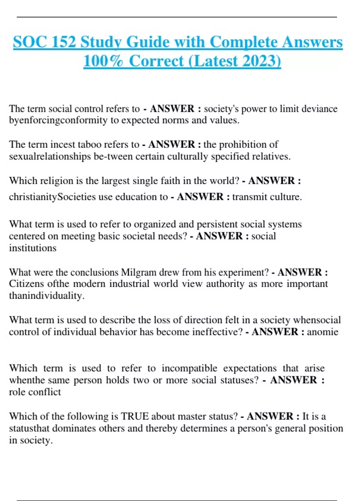 SOC 152 Study Guide with Complete Answers 100% Correct (Latest 2023)