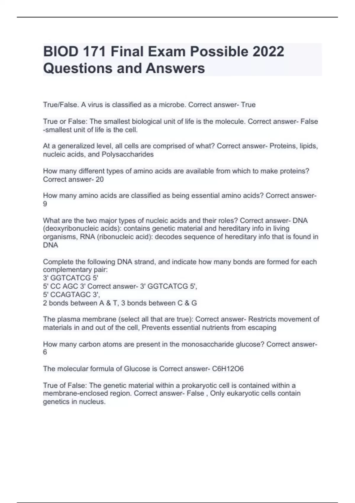 BIOD 171 Final Exam Possible 2022 Questions and Answers (Verified Answers)