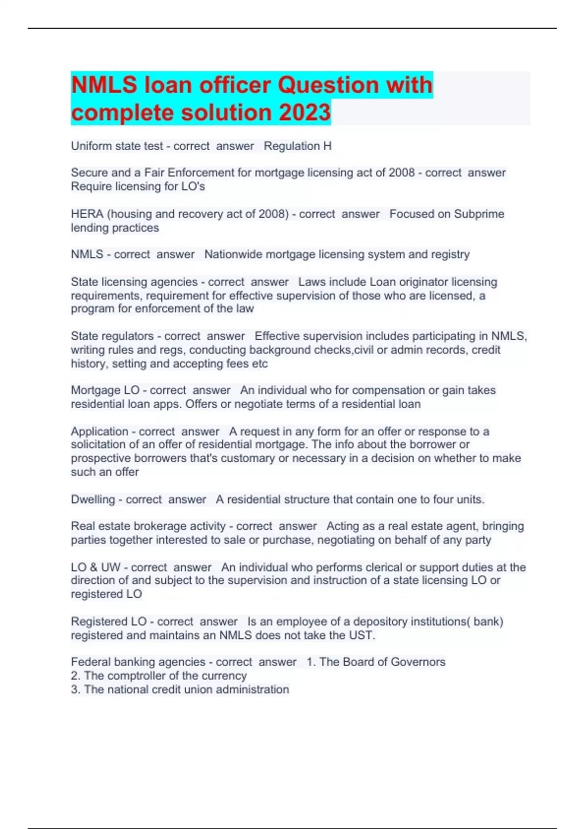 NMLS loan officer Question with complete solution 2023Uniform state test Regulation H Secure and a Fair Enforcement for mortgage licensing act of 2008 Require licensing for LO's HERA (housing and recovery act of 2008) Focused on Subprime lending practices NMLS Nationwide mortgage licensing system and registry State licensing agencies Laws include Loan originator licensing requirements, requirement for effective supervision of those who are licensed, a program for enforcement of the law State regulators Effective supervision includes participating in NMLS, writing rules and regs, conducting background checks,civil or admin records, credit history, setting and accepting fees etc Mortgage LO An individual who for compensation or gain takes residential loan apps. Offers or negotiate terms of a residential loan Application A request in any form for an offer or response to a solicitation of an offer of residential mortgage. The info about the borrower or prospective borrowers that's customary or necessary in a decision on whether to make such an offer Dwelling A residential structure that contain one to four units. Real estate brokerage activity Acting as a real estate agent, bringing parties together interested to sale or purchase, negotiating on behalf of any party LO & UW An individual who performs clerical or support duties at the direction of and subject to the supervision and instruction of a state licensing LO or registered LO Registered LO Is an employee of a depository institutions( bank) registered and maintains an NMLS does not take the UST. Federal banking agencies 1. The Board of Governors 2. The comptroller of the currency 3. The national credit union administration 4. The federal deposit insurance corporation State licensed LO Not an employee of a depository institution, a subsidiary that is owned and controlled by a depository institution and regulated by a federal agency, an institution regulated by the farm credit admin Unique identifier NMLS # should be shown on advertisements, business card, websites an any other document as established by rule, regulation, or state agency Housing finance agency Is any authority whose activities make it eligible to be a member of the National council of state housing agencies Pre-licensing education 3 hours of federal law regs, 3 hours of ethics, two hours of non traditional mortgage products. 20 hrs course in total Testing and retesting Must pass a written test developed by NMLS pass with 75% or above. Fails can take two additional times 3o days between each, then six months before taking it again. A LO who fail too maintain a valid license for 5 years or longer must retake. Surety Bond Each LO must be covered by a surety bond. The amount should reflect the dollar amount of loans originated Net worth Some states require LO to maintain a minimum net worth