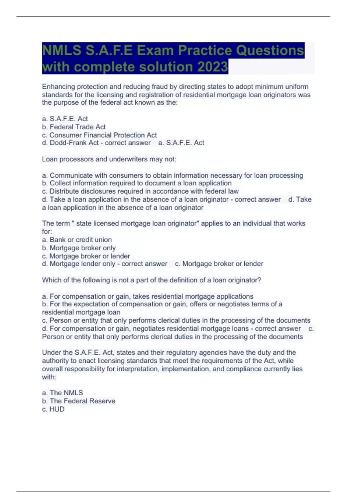 NMLS S.A.F.E Exam Practice Questions with complete solution 2023Enhancing protection and reducing fraud by directing states to adopt minimum uniform standards for the licensing and registration of residential mortgage loan originators was the purpose of the federal act known as the: a. S.A.F.E. Act b. Federal Trade Act c. Consumer Financial Protection Act d. Dodd-Frank Act a. S.A.F.E. Act Loan processors and underwriters may not: a. Communicate with consumers to obtain information necessary for loan processing b. Collect information required to document a loan application c. Distribute disclosures required in accordance with federal law d. Take a loan application in the absence of a loan originator d. Take a loan application in the absence of a loan originator The term " state licensed mortgage loan originator" applies to an individual that works for: a. Bank or credit union b. Mortgage broker only c. Mortgage broker or lender d. Mortgage lender only c. Mortgage broker or lender Which of the following is not a part of the definition of a loan originator? a. For compensation or gain, takes residential mortgage applications b. For the expectation of compensation or gain, offers or negotiates terms of a residential mortgage loan c. Person or entity that only performs clerical duties in the processing of the documents d. For compensation or gain, negotiates residential mortgage loans c. Person or entity that only performs clerical duties in the processing of the documents Under the S.A.F.E. Act, states and their regulatory agencies have the duty and the authority to enact licensing standards that meet the requirements of the Act, while overall responsibility for interpretation, implementation, and compliance currently lies with: a. The NMLS b. The Federal Reserve c. HUD d. The CFPB d. The CFPB