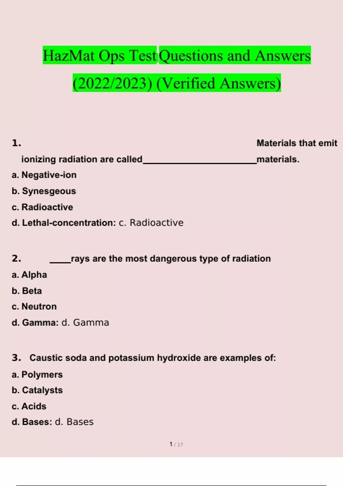 HazMat Ops Test.docx Questions and Answers 2023 (Verified Answers)
