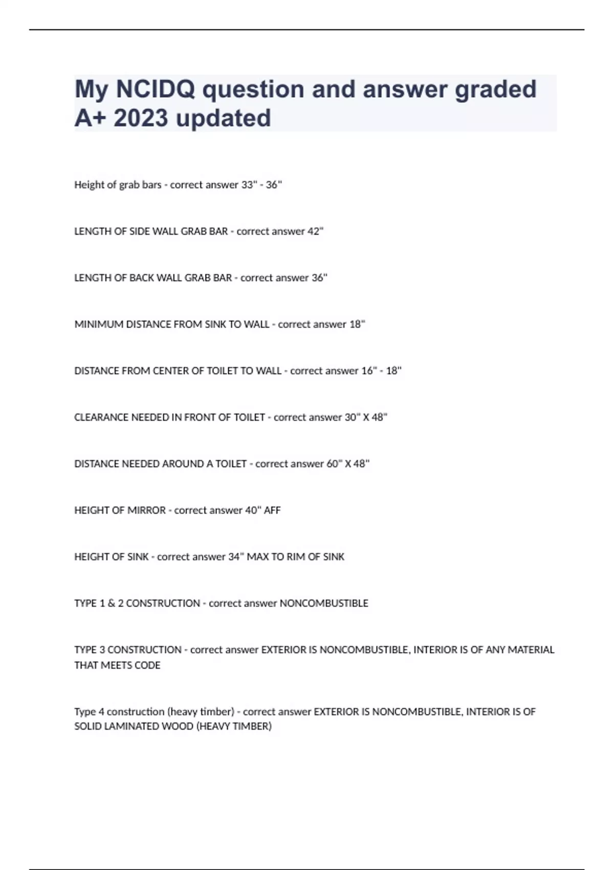 My NCIDQ question and answer graded A+ 2023 updatedHeight of grab bars 33" - 36" LENGTH OF SIDE WALL GRAB BAR 42" LENGTH OF BACK WALL GRAB BAR 36" MINIMUM DISTANCE FROM SINK TO WALL 18" DISTANCE FROM CENTER OF TOILET TO WALL 16" - 18" CLEARANCE NEEDED IN FRONT OF TOILET 30" X 48" DISTANCE NEEDED AROUND A TOILET 60" X 48" HEIGHT OF MIRROR 40" AFF HEIGHT OF SINK 34" MAX TO RIM OF SINK TYPE 1 & 2 CONSTRUCTION NONCOMBUSTIBLE TYPE 3 CONSTRUCTION EXTERIOR IS NONCOMBUSTIBLE, INTERIOR IS OF ANY MATERIAL THAT MEETS CODE Type 4 construction (heavy timber) EXTERIOR IS NONCOMBUSTIBLE, INTERIOR IS OF SOLID LAMINATED WOOD (HEAVY TIMBER) TYPE 5 CONSTRUCTION EXTERIOR & INTERIOR ARE OF ANY MATERIAL PERMITTED BY CODE