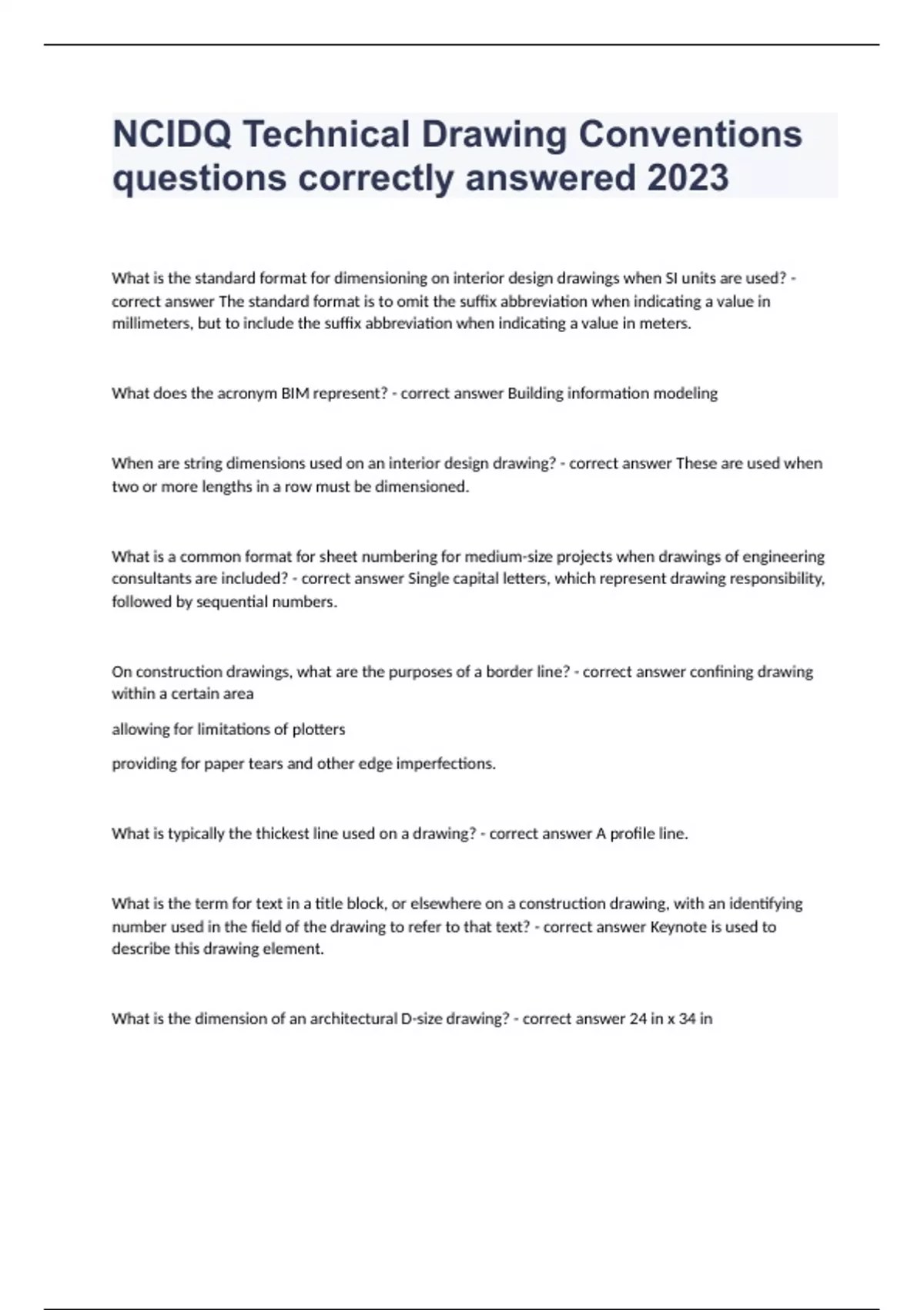 NCIDQ Technical Drawing Conventions questions correctly answered 2023What is the standard format for dimensioning on interior design drawings when SI units are used? - correct answer The standard format is to omit the suffix abbreviation when indicating a value in millimeters, but to include the suffix abbreviation when indicating a value in meters. What does the acronym BIM represent? - correct answer Building information modeling When are string dimensions used on an interior design drawing? - correct answer These are used when two or more lengths in a row must be dimensioned. What is a common format for sheet numbering for medium-size projects when drawings of engineering consultants are included? - correct answer Single capital letters, which represent drawing responsibility, followed by sequential numbers. On construction drawings, what are the purposes of a border line? - correct answer confining drawing within a certain area allowing for limitations of plotters providing for paper tears and other edge imperfections. What is typically the thickest line used on a drawing? - correct answer A profile line. What is the term for text in a title block, or elsewhere on a construction drawing, with an identifying number used in the field of the drawing to refer to that text? - correct answer Keynote is used to describe this drawing element. What is the dimension of an architectural D-size drawing? - correct answer 24 in x 34 in