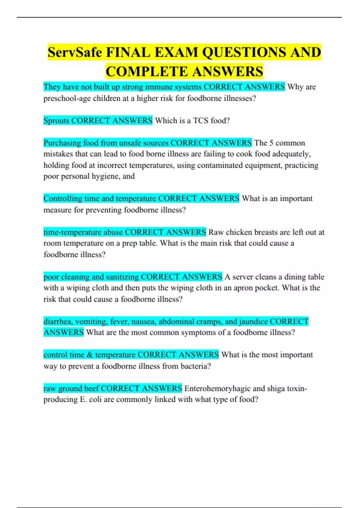 ServSafe FINAL EXAM QUESTIONS AND COMPLETE ANSWERS Why are preschool-age children at a higher risk for foodborne illnesses? Which is a TCS food? The 5 common mistakes that can lead to food borne illness are failing to cook food adequately, holding food at incorrect temperatures, using contaminated equipment, practicing poor personal hygiene, and What is an important measure for preventing foodborne illness? Raw chicken breasts are left out at room temperature on a prep table. What is the main risk that could cause a foodborne illness? A server cleans a dining table with a wiping cloth and then puts the wiping cloth in an apron pocket. What is the risk that could cause a foodborne illness? What are the most common symptoms of a foodborne illness? What is the most important way to prevent a foodborne illness from bacteria? Enterohemoryhagic and shiga toxin-producing E. coli are commonly linked with what type of food? What is the most important way to prevent a foodborne illness from viruses? A customer called an operation and told the manager about getting sick after eating there. The customer complained of vomiting and diarrhea a few hours after eating the raw oysters. What pathogen probably caused the illness? Parasites are commonly linked with what type of food?