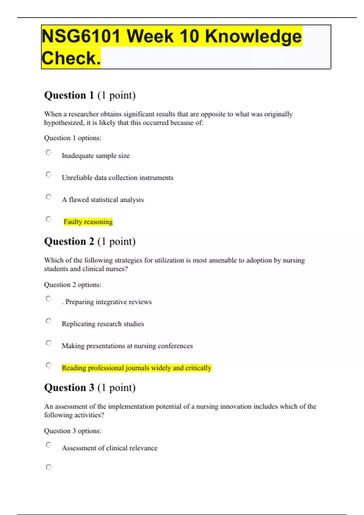 NSG6101 Week 10 Knowledge Check. Question 1 (1 point) When a researcher obtains significant results that are opposite to what was originally hypothesized, it is likely that this occurred because of: Question 1 options: Inadequate sample size Unreliable data collection instruments A flawed statistical analysis Faulty reasoning Question 2 (1 point) Which of the following strategies for utilization is most amenable to adoption by nursing students and clinical nurses? Question 2 options: