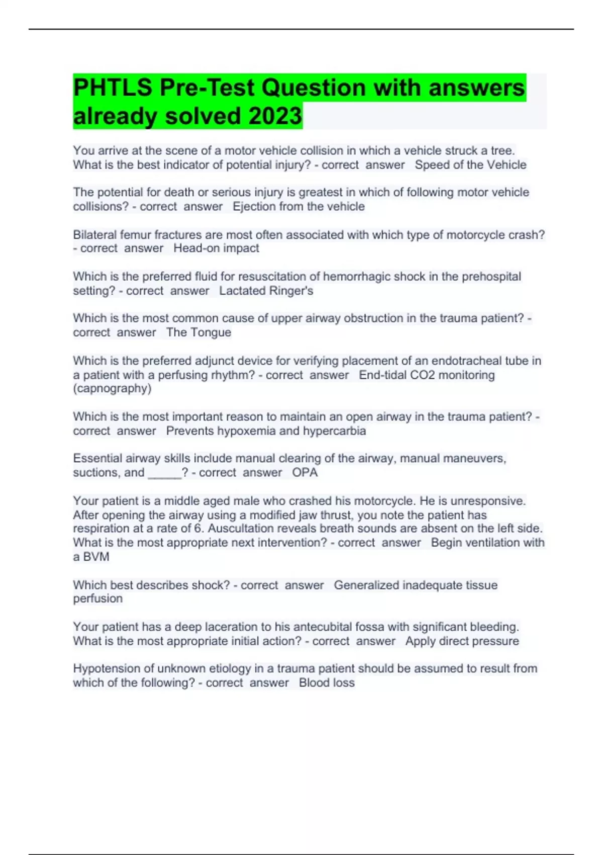 PHTLS Pre-Test Question with answers already solved 2023You arrive at the scene of a motor vehicle collision in which a vehicle struck a tree. What is the best indicator of potential injury? Speed of the Vehicle The potential for death or serious injury is greatest in which of following motor vehicle collisions? Ejection from the vehicle Bilateral femur fractures are most often associated with which type of motorcycle crash? Head-on impact Which is the preferred fluid for resuscitation of hemorrhagic shock in the prehospital setting? Lactated Ringer's Which is the most common cause of upper airway obstruction in the trauma patient? The Tongue Which is the preferred adjunct device for verifying placement of an endotracheal tube in a patient with a perfusing rhythm? End-tidal CO2 monitoring (capnography) Which is the most important reason to maintain an open airway in the trauma patient? Prevents hypoxemia and hypercarbia Essential airway skills include manual clearing of the airway, manual maneuvers, suctions, and _____? OPA Your patient is a middle aged male who crashed his motorcycle. He is unresponsive. After opening the airway using a modified jaw thrust, you note the patient has respiration at a rate of 6. Auscultation reveals breath sounds are absent on the left side. What is the most appropriate next intervention? Begin ventilation with a BVM Which best describes shock? Generalized inadequate tissue perfusion Your patient has a deep laceration to his antecubital fossa with significant bleeding. What is the most appropriate initial action? Apply direct pressure Hypotension of unknown etiology in a trauma patient should be assumed to result from which of the following? Blood loss Which assessment is most beneficial in differentiating hemorrhagic shock from neurogenic shock in the prehospital setting? Skin The body initially compensates for blood loss through activation of which of the following? Sympathetic nervous system Medication used by trauma patients for pre-existing conditions may cause which of the following? Beta blockers may prevent tachycardia with blood loss The target blood pressure for a trauma patient with suspected intraabdominal hemorrhage is which of the following? 80-90 mmHG Which best explains the mechanism by which gas exchange is impaired in pulmonary contusion? Blood in the alveoli Which of the following is a key finding that differentiates cardiac tamponade from tension pneumothorax? Equal breath sounds Your patient is a 20 year old male who struck his head on a teammate's knee while diving to catch a football. He was not wearing a helmet. He demonstrates decerebrate posturing and has a GCS score of 4. His heart rate is 58, BP 108/102, and his left pupil is dilated. What is the best ventilation rate to use when managing this patient? 20 breaths per minute