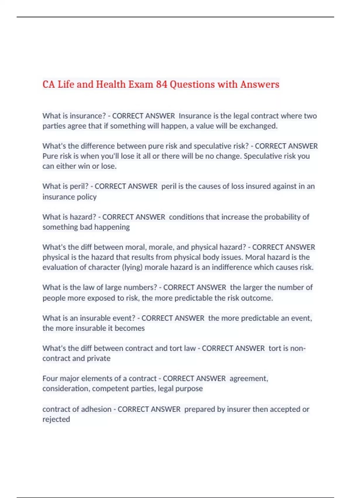 CA Life and Health Exam 84 Questions with Answers What is insurance? - CORRECT ANSWER Insurance is the legal contract where two parties agree that if something will happen, a value will be exchanged. What's the difference between pure risk and speculative risk? - CORRECT ANSWER Pure risk is when you'll lose it all or there will be no change. Speculative risk you can either win or lose. What is peril? - CORRECT ANSWER peril is the causes of loss insured against in an insurance policy What is hazard? - CORRECT ANSWER conditions that increase the probability of something bad happening What's the diff between moral, morale, and physical hazard? - CORRECT ANSWER physical is the hazard that results from physical body issues. Moral hazard is the evaluation of character (lying) morale hazard is an indifference which causes risk. What is the law of large numbers? - CORRECT ANSWER the larger the number of people more exposed to risk, the more predictable the risk outcome. What is an insurable event? - CORRECT ANSWER the more predictable an event, the more insurable it becomes What's the diff between contract and tort law - CORRECT ANSWER tort is non-contract and private Four major elements of a contract - CORRECT ANSWER agreement, consideration, competent parties, legal purpose contract of adhesion - CORRECT ANSWER prepared by insurer then accepted or rejected Conditional contract - CORRECT ANSWER conditions need to be met in order for contract to be executed aleatory contract - CORRECT ANSWER exchange of unequal amounts of value unilateral contract - CORRECT ANSWER only one party is forced to do something personal contract - CORRECT ANSWER can't be transferred w/out notifying insurer When can you rescind a contract - CORRECT ANSWER intentional or unintentional concealment, violation of material warranty, false material representation six specifications for insurance policies - CORRECT ANSWER parties contracted person insured statement of insurable interest risks insured against time period stated premium 4 categories of info necessary for financial planning - CORRECT ANSWER debt income mortgage expenses key person insurance - CORRECT ANSWER losing someone key to a business buy-sell insurance (business continuation) - CORRECT ANSWER what will be done with a business if the owner dies Premiums - CORRECT ANSWER life insurance payment installments term life insurance - CORRECT ANSWER covered only for a specific term three types of term life insurance - CORRECT ANSWER level increasing decreasing fixed life insurance is - CORRECT ANSWER contracts that offer guaranteed minimum or stated benefits Variable life insurance is - CORRECT ANSWER where it keeps place with inflation and cash value accumulates based upon a specific portfolio of stocks (investment based) ; level fixed Class designation for beneficiaries - CORRECT ANSWER Consideration clause - CORRECT ANSWER states value offered by insured (amount of premium payment) accumulation period - CORRECT ANSWER when the annuitant makes payments and grow tax deferred What is not funded by an annuity - CORRECT ANSWER death benefits Annuitants must be a - CORRECT ANSWER natural person Gross premium = - CORRECT ANSWER Mortality - Interest + Expenses What types of services are provided under long-term care's assisted living - CORRECT ANSWER linens and personal laundry service assistance with dressing and bathing reminders regarding medication assistance with eating Assisted living offers nonmedical assistance. What does the guaranteed insurability rider allow for - CORRECT ANSWER specific additional amounts of insurance to be purchased at specific ages, dates and events without proving insurability however, the coverage is purchased at the insured's attained age and the maximum allowable purchase is specified in the base policy. This rider usually expires at the insured's age 40. A tax-sheltered annuity is a special tax-favored retirement plan available to - CORRECT ANSWER Certain groups of employees only. The interest earned on policy dividends is - CORRECT ANSWER Taxable If a person receives benefits for long term care from Medi-Cal, when that recipient dies, the state may - CORRECT ANSWER Pursue asset recovery against the estate of the recipient. According to the Medical Loss Ratio (MLR), what is the minimum percentage of health coverage premium that must be applied to actual medical care in a large group health plan? - CORRECT ANSWER 85, 80 for small What is not covered under a long-term care policy? - CORRECT ANSWER Acute care in hospital Who owns the policy in executive bonuses - CORRECT ANSWER employee Where does info from MIB come from - CORRECT ANSWER underwriting disclosures What is covered under Medicare A - CORRECT ANSWER a) Post-hospital nursing care. b) Home health services. c) In-patient hospital services What happens when you have two or more health plans - CORRECT ANSWER benefits are coordinated A person who can only sell life insurance is called - CORRECT ANSWER a life-only agent What is a dread disease policy - CORRECT ANSWER limited policy that specifically overwrites cancer expense A hospital indemnity policy will pay - CORRECT ANSWER A benefit for each day the insured is in a hospital. Who must pay for the cost of a medical examination required in the process of underwriting? - CORRECT ANSWER Insurer The paid-up addition option uses the dividend - CORRECT ANSWER To purchase a smaller amount of the same type of insurance as the original policy. An insured receives an annual life insurance dividend check. What term best describes this arrangement? - CORRECT ANSWER cash option In reference to the standard Medicare Supplement benefits plans, what does the term standard mean? - CORRECT ANSWER All providers will have the same coverage options and conditions for each plan. A domestic insurer issuing variable contracts must establish one or more - CORRECT ANSWER separate accounts If a firm has 30 employees that are actively engaged in business on 