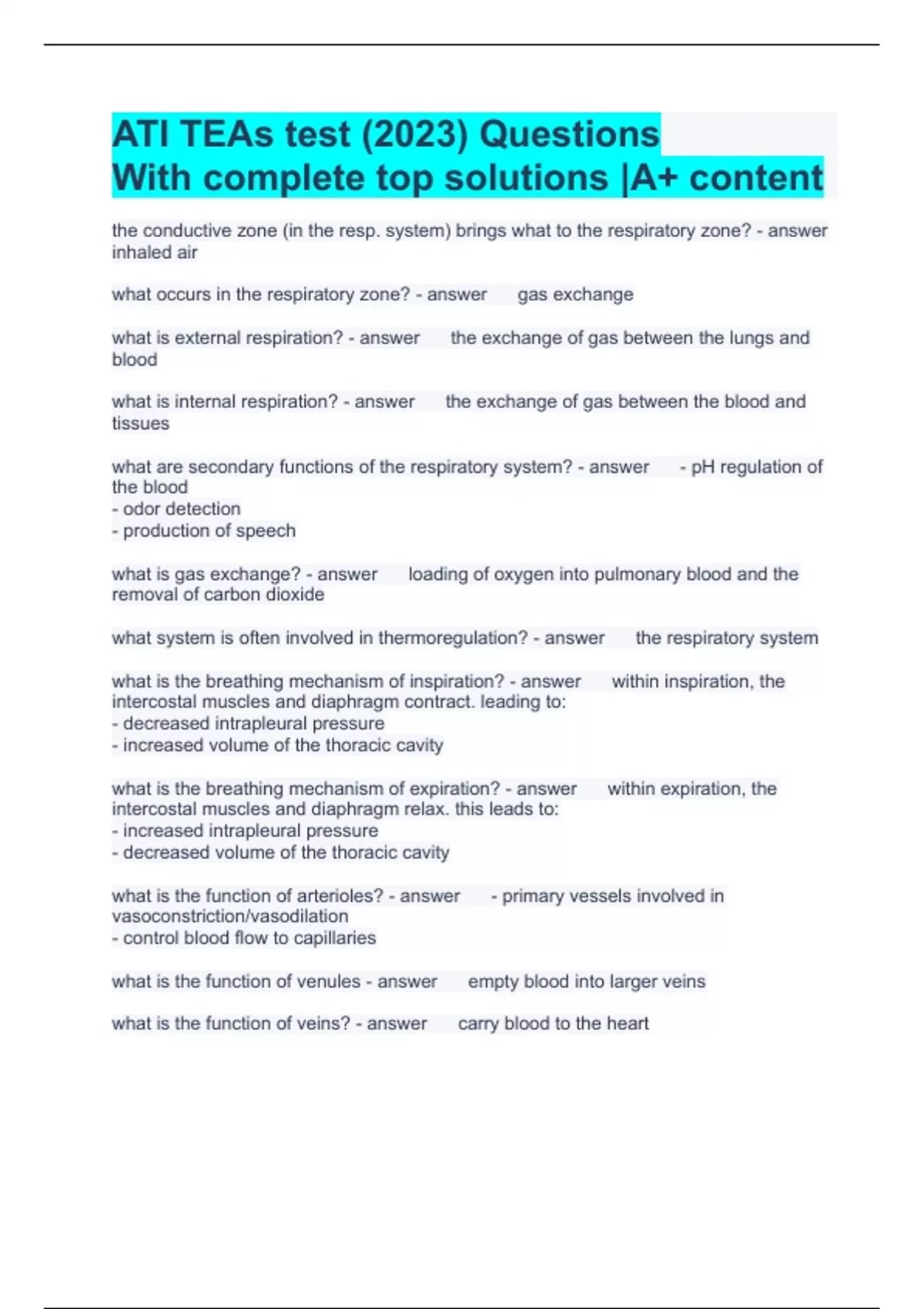 ATI TEAs test (2023) Questions With complete top solutions |A+ content the conductive zone (in the resp. system) brings what to the respiratory zone? inhaled air what occurs in the respiratory zone? gas exchange what is external respiration? the exchange of gas between the lungs and blood what is internal respiration? the exchange of gas between the blood and tissues what are secondary functions of the respiratory system? - pH regulation of the blood - odor detection - production of speech what is gas exchange? loading of oxygen into pulmonary blood and the removal of carbon dioxide what system is often involved in thermoregulation? the respiratory system what is the breathing mechanism of inspiration? within inspiration, the intercostal muscles and diaphragm contract. leading to: - decreased intrapleural pressure - increased volume of the thoracic cavity what is the breathing mechanism of expiration? within expiration, the intercostal muscles and diaphragm relax. this leads to: - increased intrapleural pressure - decreased volume of the thoracic cavity what is the function of arterioles? - primary vessels involved in vasoconstriction/vasodilation - control blood flow to capillaries what is the function of venules empty blood into larger veins what is the function of veins? carry blood to the heart