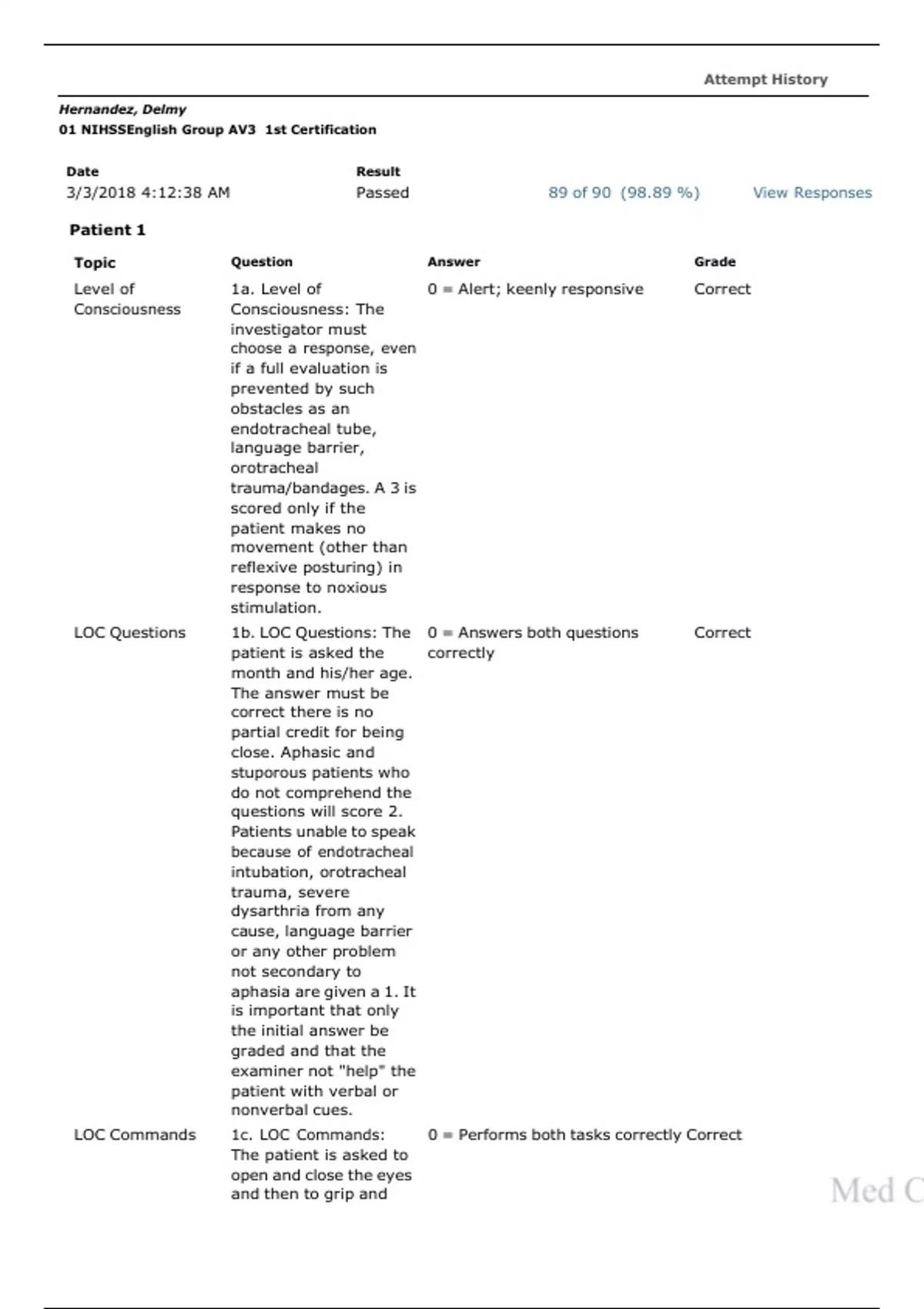 STROKE SCA 411-STROKE SCALE ANSWERS/STROKE SCA 411-STROKE SCALE ANSWERS. Topic Question Answer Grade Level of Consciousness 1a. Level of Consciousness: The investigator must choose a response, even if a full evaluation is prevented by such obstacles as an endotracheal tube, language barrier, orotracheal trauma/bandages. A 3 is scored only if the patient makes no movement (other than reflexive posturing) in response to noxious stimulation.