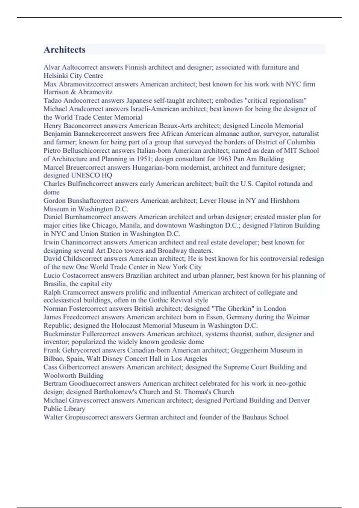 Alvar Aaltocorrect answers Finnish architect and designer; associated with furniture and Helsinki City Centre Max Abramovitzcorrect answers American architect; best known for his work with NYC firm Harrison & Abramovitz Tadao Andocorrect answers Japanese self-taught architect; embodies "critical regionalism" Michael Aradcorrect answers Israeli-American architect; best known for being the designer of the World Trade Center Memorial Henry Baconcorrect answers American Beaux-Arts architect; designed Lincoln Memorial Benjamin Bannekercorrect answers free African American almanac author, surveyor, naturalist and farmer; known for being part of a group that surveyed the borders of District of Columbia Pietro Belluschicorrect answers Italian-born American architect; named as dean of MIT School of Architecture and Planning in 1951; design consultant for 1963 Pan Am Building Marcel Breuercorrect answers Hungarian-born modernist, architect and furniture designer; designed UNESCO HQ Charles Bulfinchcorrect answers early American architect; built the U.S. Capitol rotunda and dome Gordon Bunshaftcorrect answers American architect; Lever House in NY and Hirshhorn Museum in Washington D.C. Daniel Burnhamcorrect answers American architect and urban designer; created master plan for major cities like Chicago, Manila, and downtown Washington D.C.; designed Flatiron Building in NYC and Union Station in Washington D.C. Irwin Chanincorrect answers American architect and real estate developer; best known for designing several Art Deco towers and Broadway theaters. David Childscorrect answers American architect; He is best known for his controversial redesign of the new One World Trade Center in New York City Lucio Costacorrect answers Brazilian architect and urban planner; best known for his planning of Brasilia, the capital city Ralph Cramcorrect answers prolific and influential American architect of collegiate and ecclesiastical buildings, often in the Gothic Revival style Norman Fostercorrect answers British architect; designed "The Gherkin" in London James Freedcorrect answers American architect born in Essen, Germany during the Weimar Republic; designed the Holocaust Memorial Museum in Washington D.C. Buckminster Fullercorrect answers American architect, systems theorist, author, designer and inventor; popularized the widely known geodesic dome Frank Gehrycorrect answers Canadian-born American architect; Guggenheim Museum in Bilbao, Spain, Walt Disney Concert Hall in Los Angeles Cass Gilbertcorrect answers American architect; designed the Supreme Court Building and Woolworth Building Bertram Goodhuecorrect answers American architect celebrated for his work in neo-gothic design; designed Bartholomew's Church and St. Thomas's Church Michael Gravescorrect answers American architect; designed Portland Building and Denver Public Library Walter Gropiuscorrect answers German architect and founder of the Bauhaus School