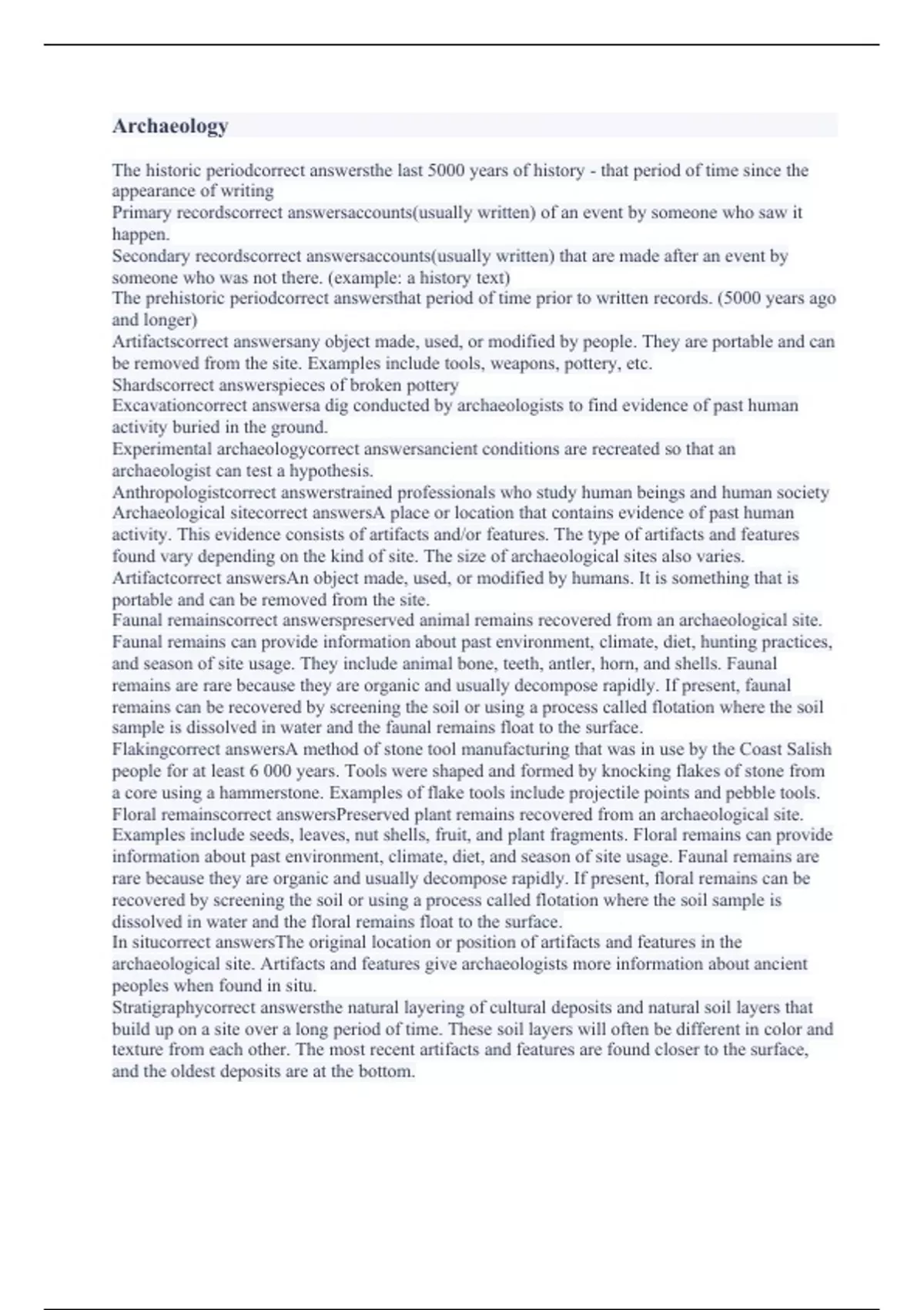 The historic periodcorrect answersthe last 5000 years of history - that period of time since the appearance of writing Primary recordscorrect answersaccounts(usually written) of an event by someone who saw it happen. Secondary recordscorrect answersaccounts(usually written) that are made after an event by someone who was not there. (example: a history text) The prehistoric periodcorrect answersthat period of time prior to written records. (5000 years ago and longer) Artifactscorrect answersany object made, used, or modified by people. They are portable and can be removed from the site. Examples include tools, weapons, pottery, etc. Shardscorrect answerspieces of broken pottery Excavationcorrect answersa dig conducted by archaeologists to find evidence of past human activity buried in the ground. Experimental archaeologycorrect answersancient conditions are recreated so that an archaeologist can test a hypothesis. Anthropologistcorrect answerstrained professionals who study human beings and human society Archaeological sitecorrect answersA place or location that contains evidence of past human activity. This evidence consists of artifacts and/or features. The type of artifacts and features found vary depending on the kind of site. The size of archaeological sites also varies. Artifactcorrect answersAn object made, used, or modified by humans. It is something that is portable and can be removed from the site. Faunal remainscorrect answerspreserved animal remains recovered from an archaeological site. Faunal remains can provide information about past environment, climate, diet, hunting practices, and season of site usage. They include animal bone, teeth, antler, horn, and shells. Faunal remains are rare because they are organic and usually decompose rapidly. If present, faunal remains can be recovered by screening the soil or using a process called flotation where the soil sample is dissolved in water and the faunal remains float to the surface. Flakingcorrect answersA method of stone tool manufacturing that was in use by the Coast Salish people for at least 6 000 years. Tools were shaped and formed by knocking flakes of stone from a core using a hammerstone. Examples of flake tools include projectile points and pebble tools. Floral remainscorrect answersPreserved plant remains recovered from an archaeological site. Examples include seeds, leaves, nut shells, fruit, and plant fragments. Floral remains can provide information about past environment, climate, diet, and season of site usage. Faunal remains are rare because they are organic and usually decompose rapidly. If present, floral remains can be recovered by screening the soil or using a process called flotation where the soil sample is dissolved in water and the floral remains float to the surface. In situcorrect answersThe original location or position of artifacts and features in the archaeological site. Artifacts and features give archaeologists more information about ancient peoples when found in situ. Stratigraphycorrect answersthe natural layering of cultural deposits and natural soil layers that build up on a site over a long period of time. These soil layers will often be different in color and texture from each other. The most recent artifacts and features are found closer to the surface, and the oldest deposits are at the bottom.